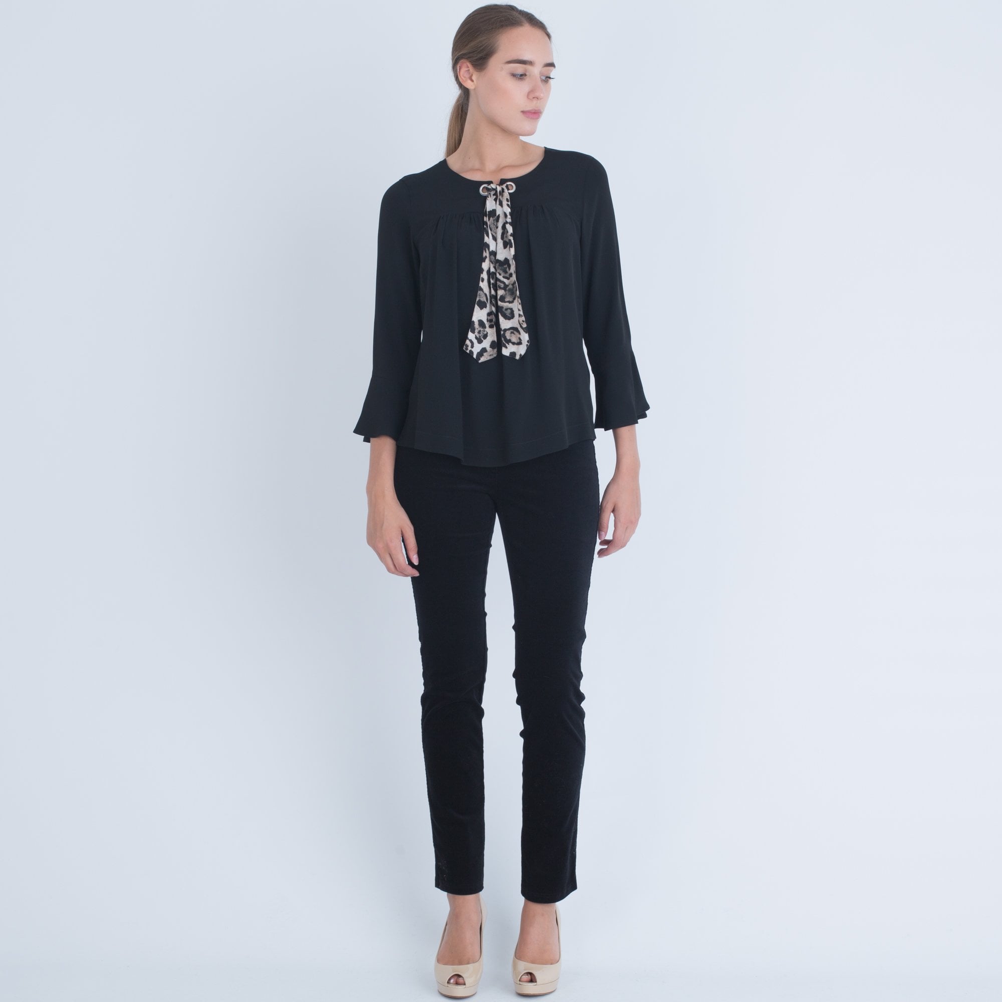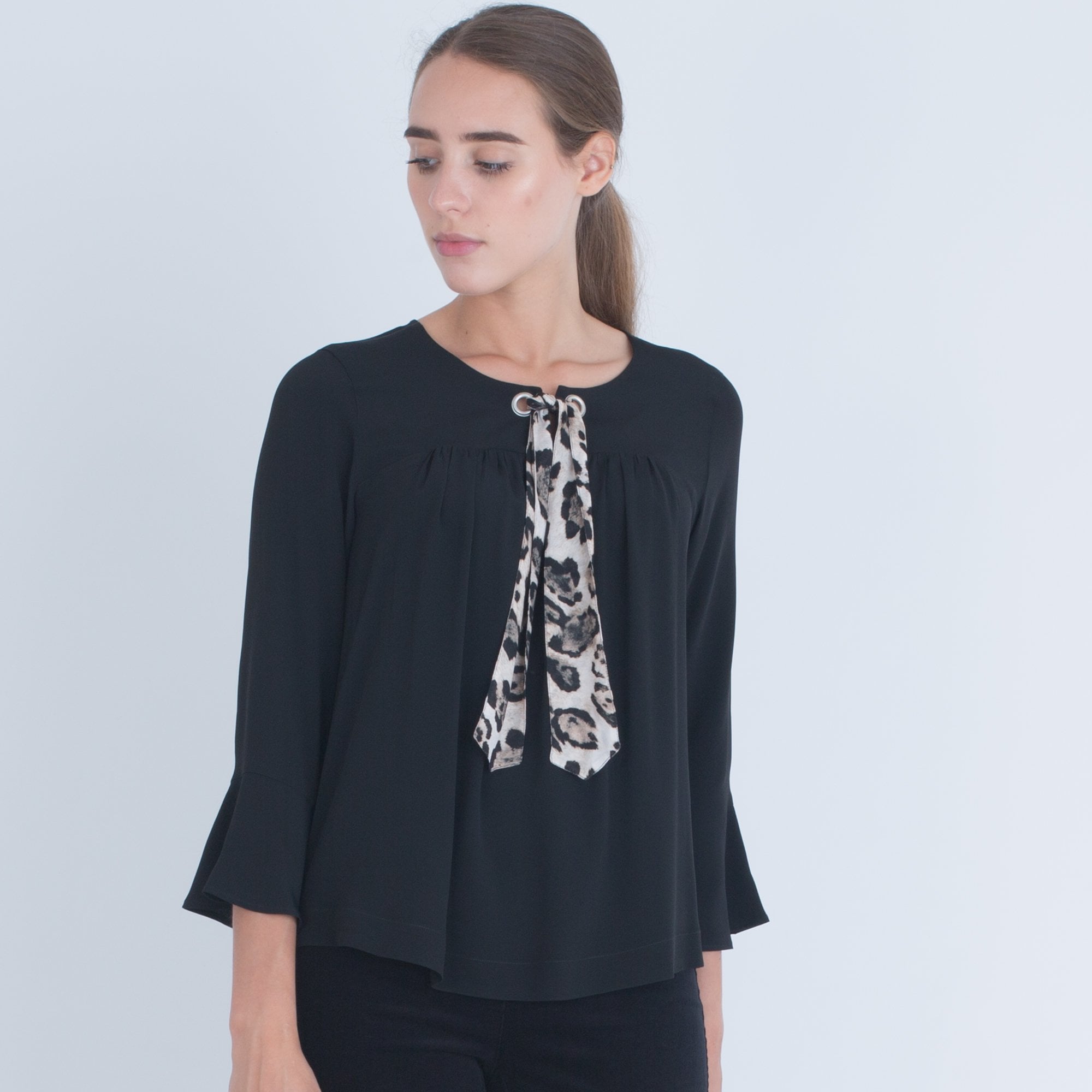 Riani Leopard Tie Blouse With Gathered Front And Flute Sleeve Black