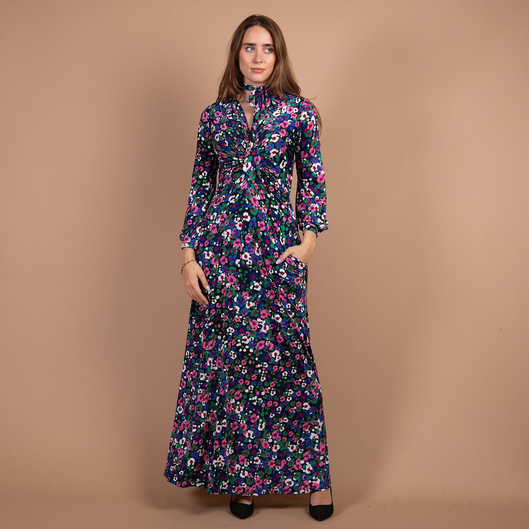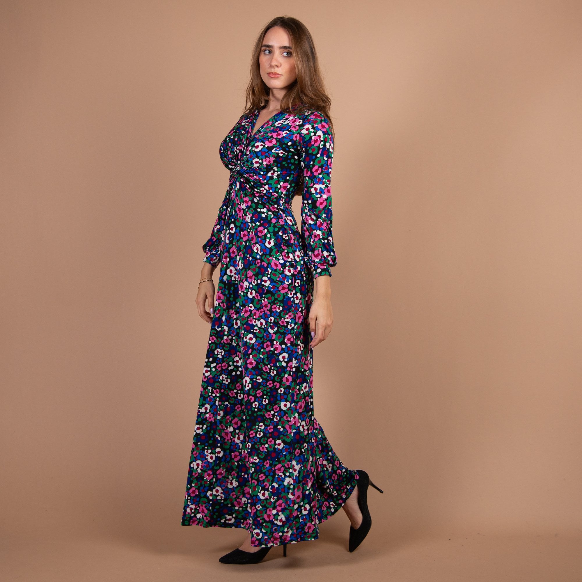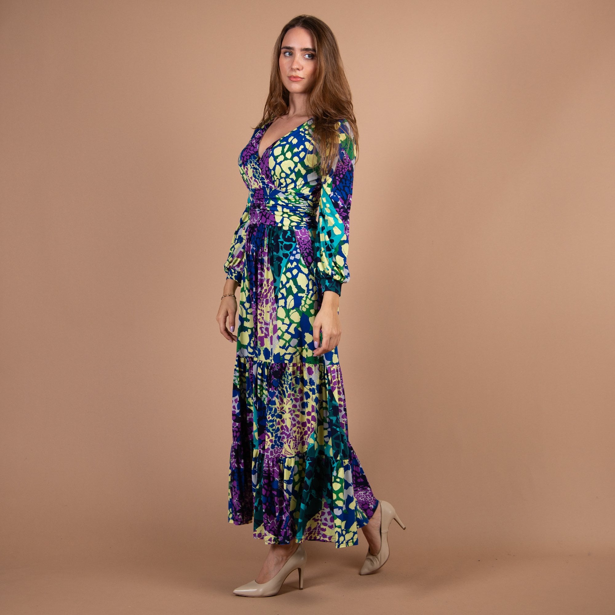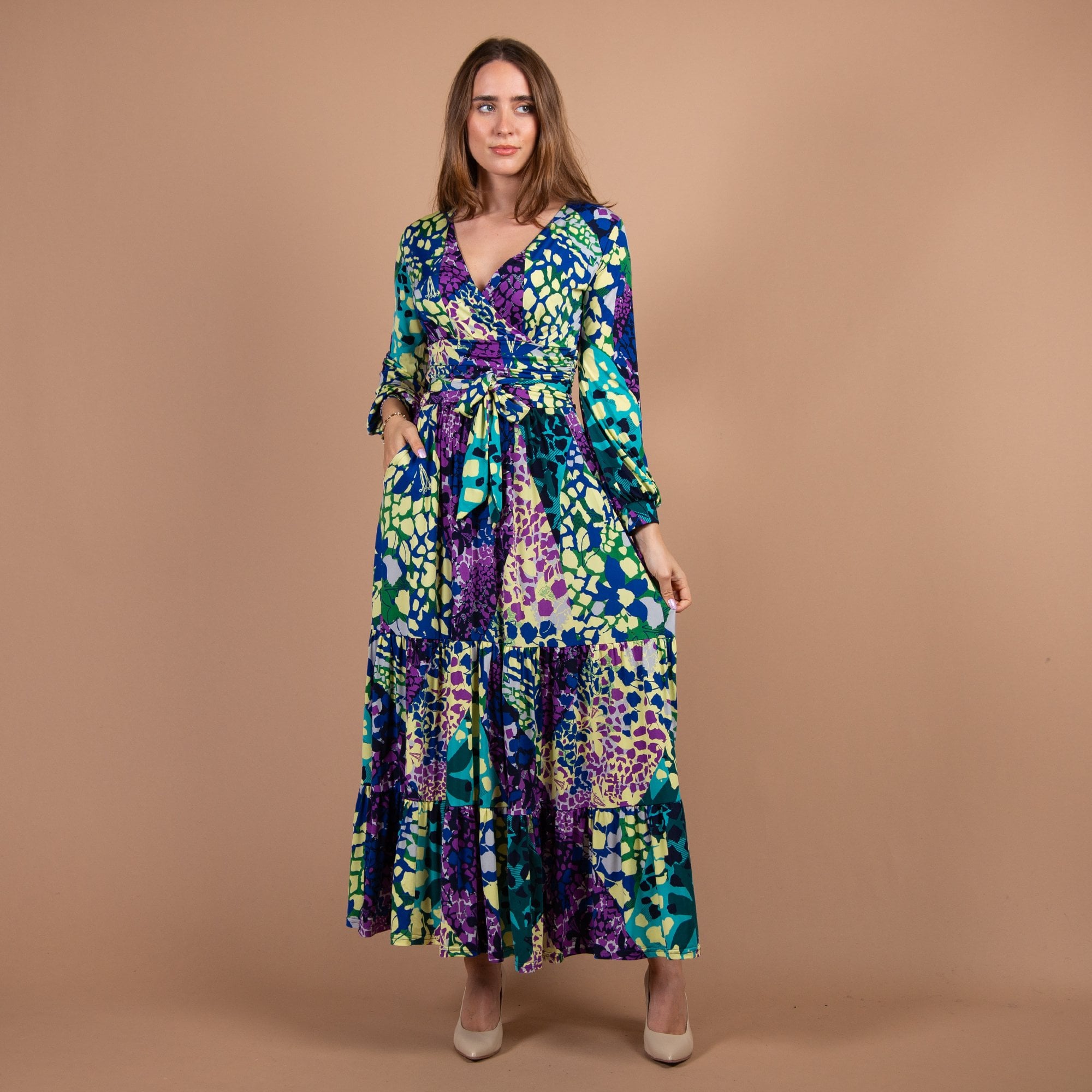Onjenu Faye Tiered Hem V Neck Waisted Maxi Dress Purple/yellow/green