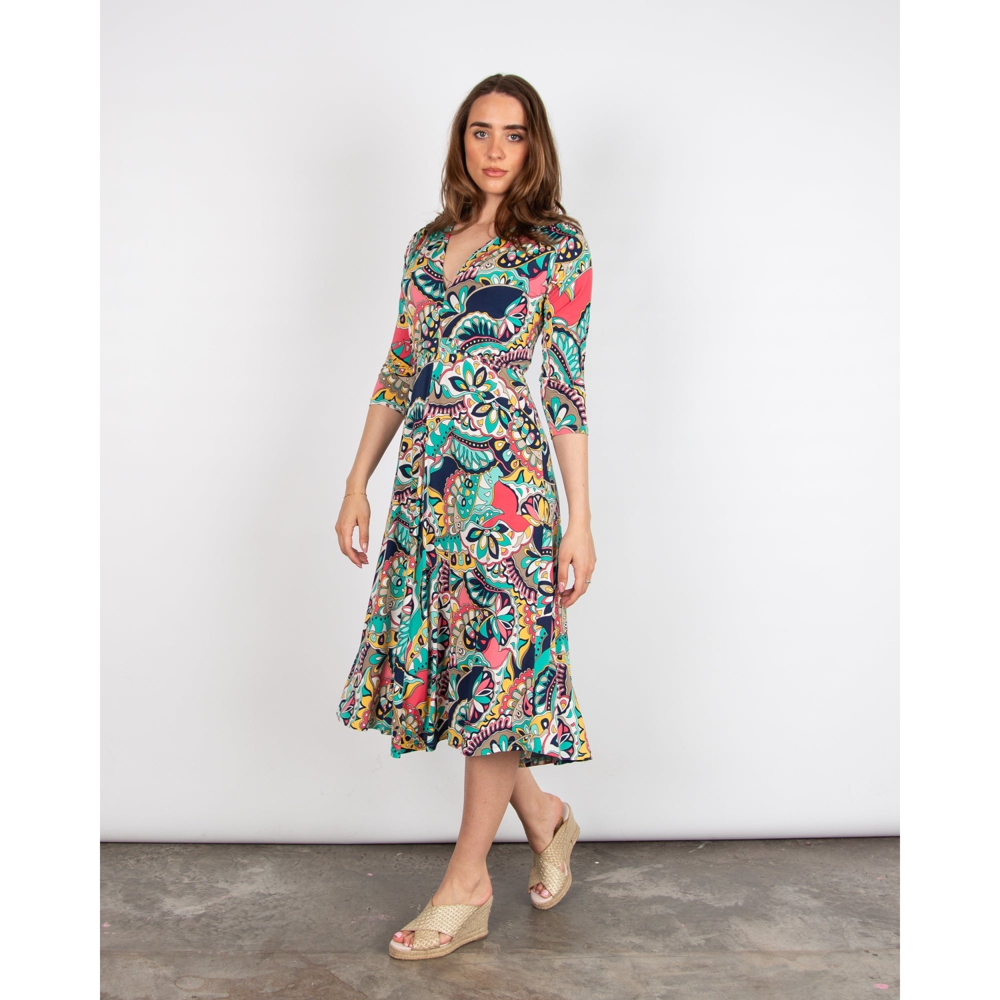 Onjenu Amy Abstract Print V Neck Tie Waist Jersey Dress Iris Aqua