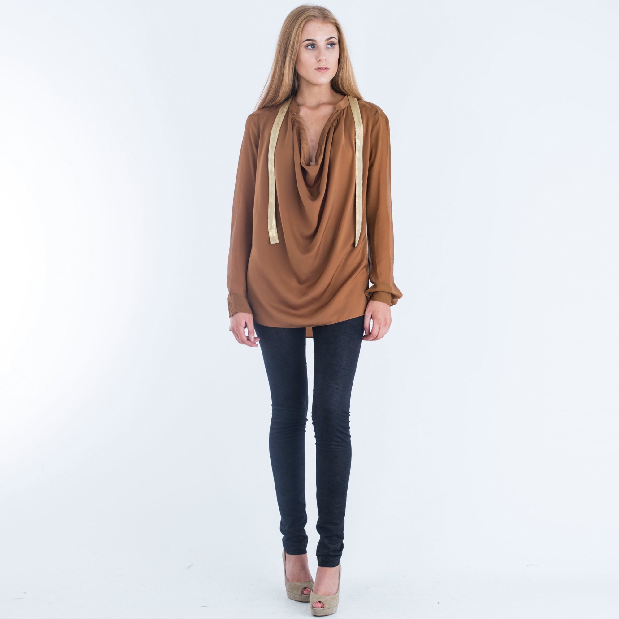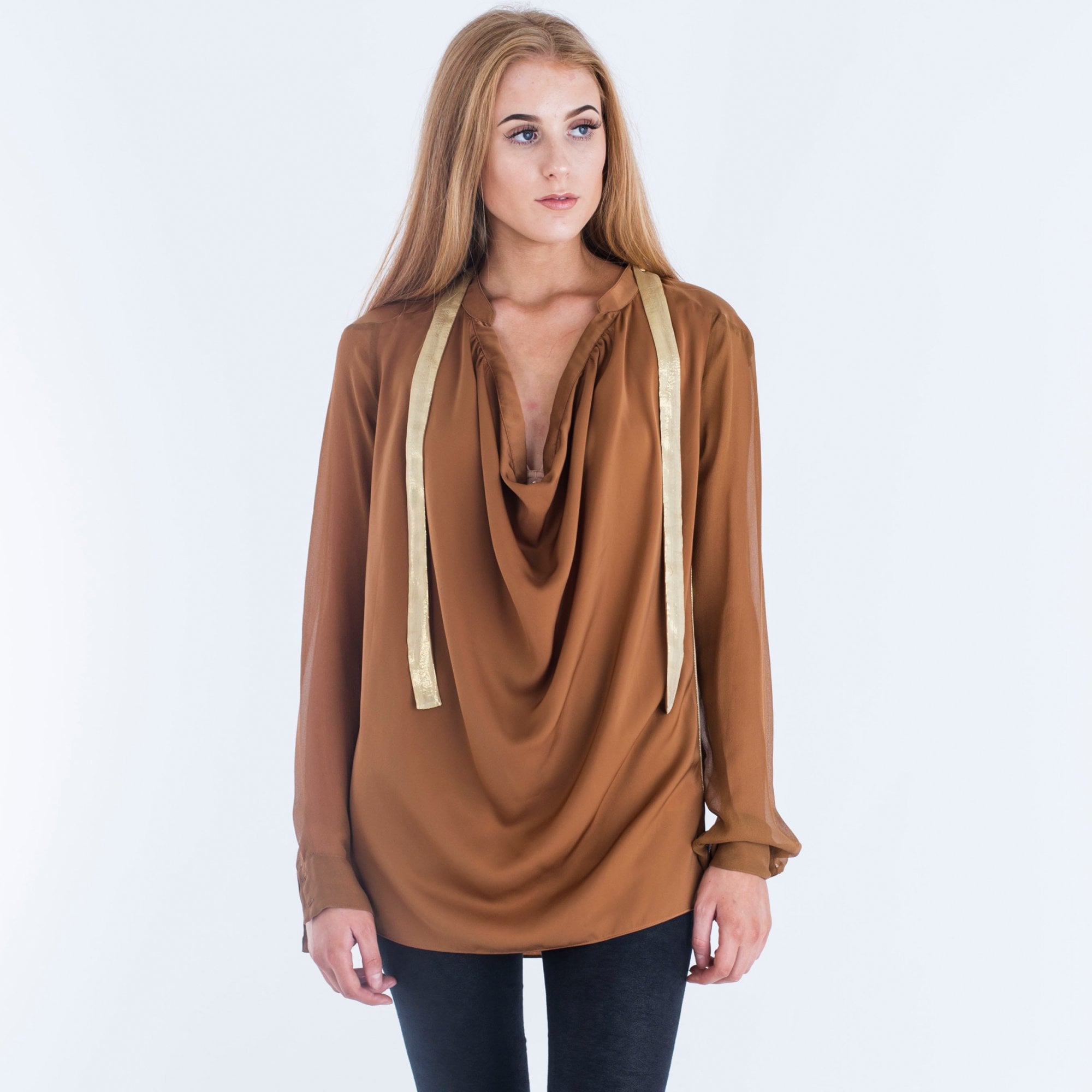 Pinko Chiffon Sleeve Lurex Tie Neck Blouse Tobacco