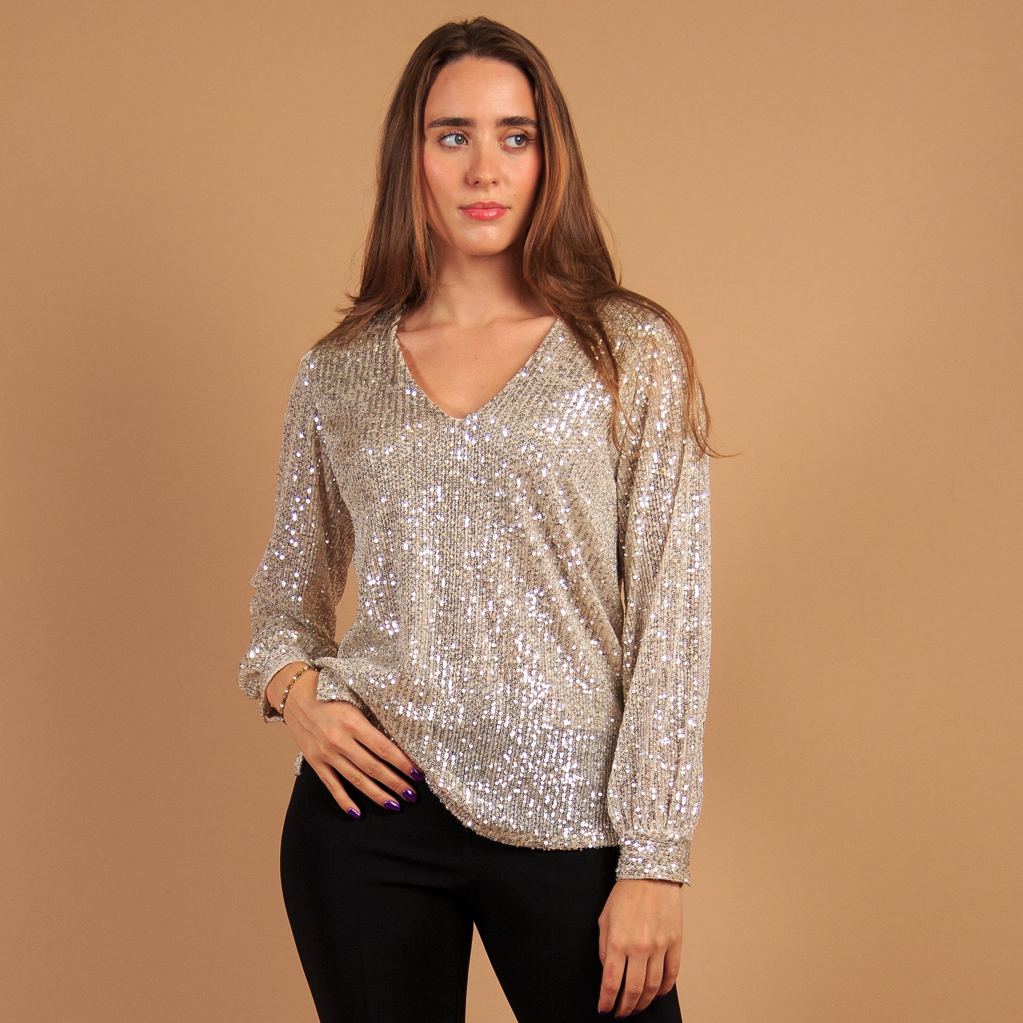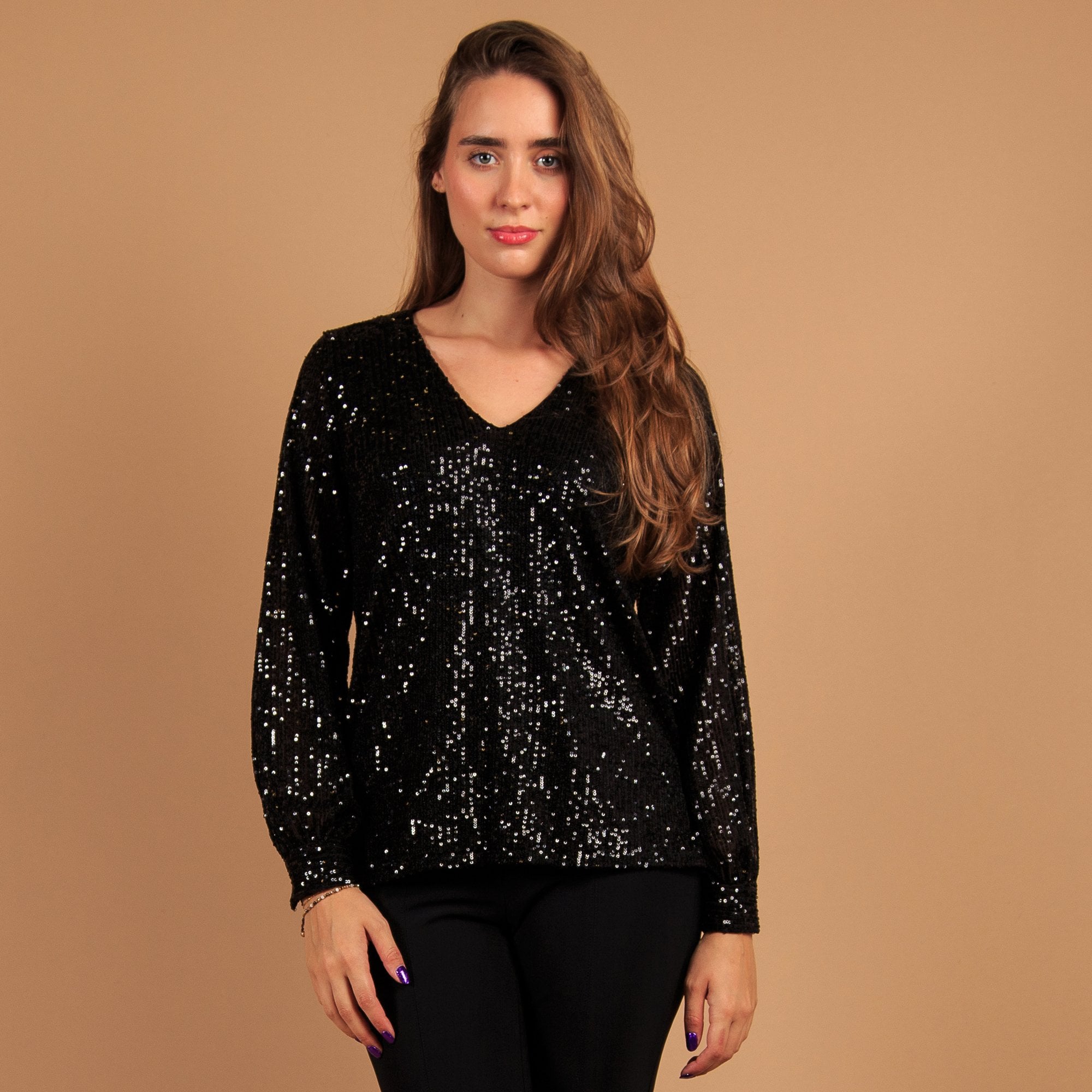 Pomodoro V Neck Sequin Top With Balloon Sleeve Black