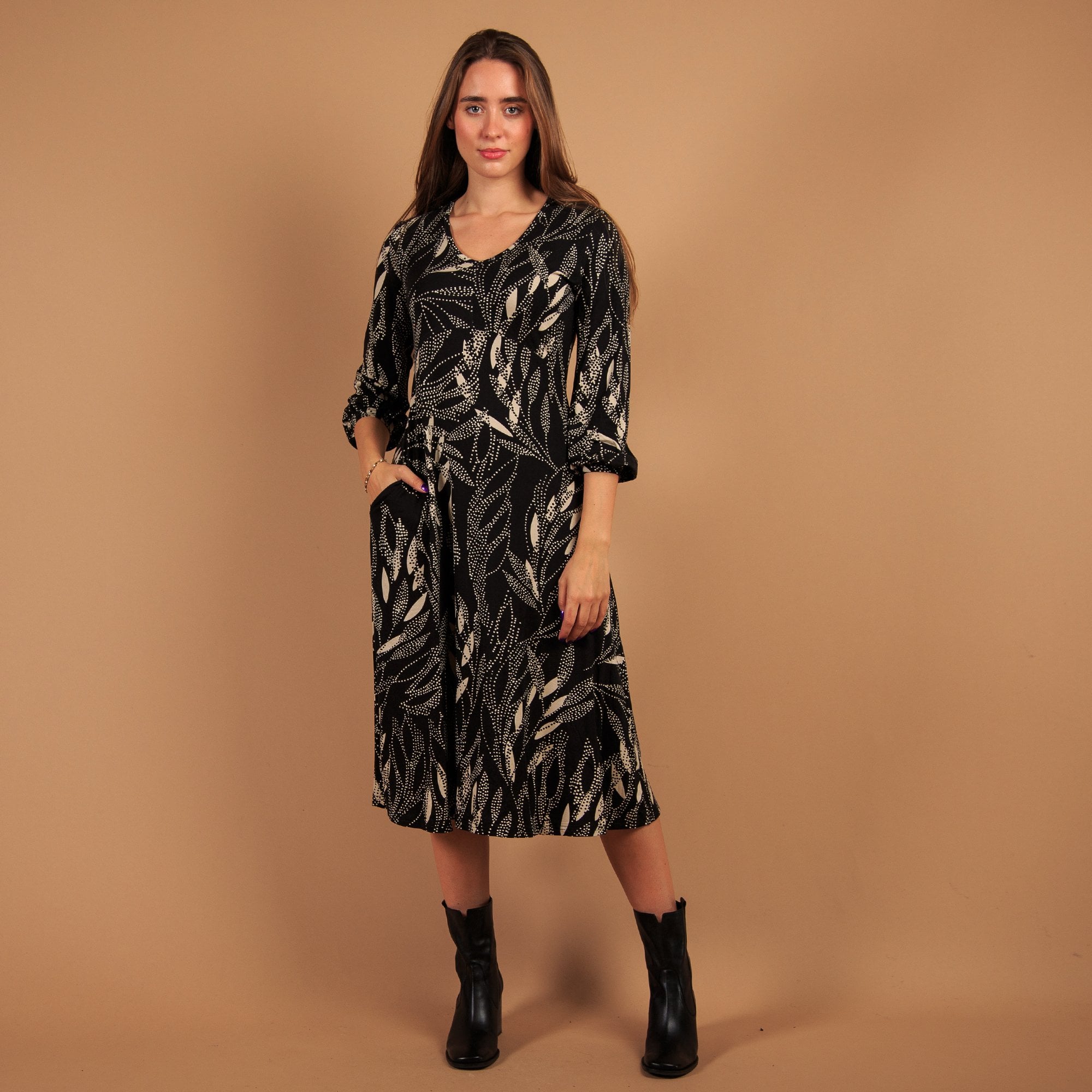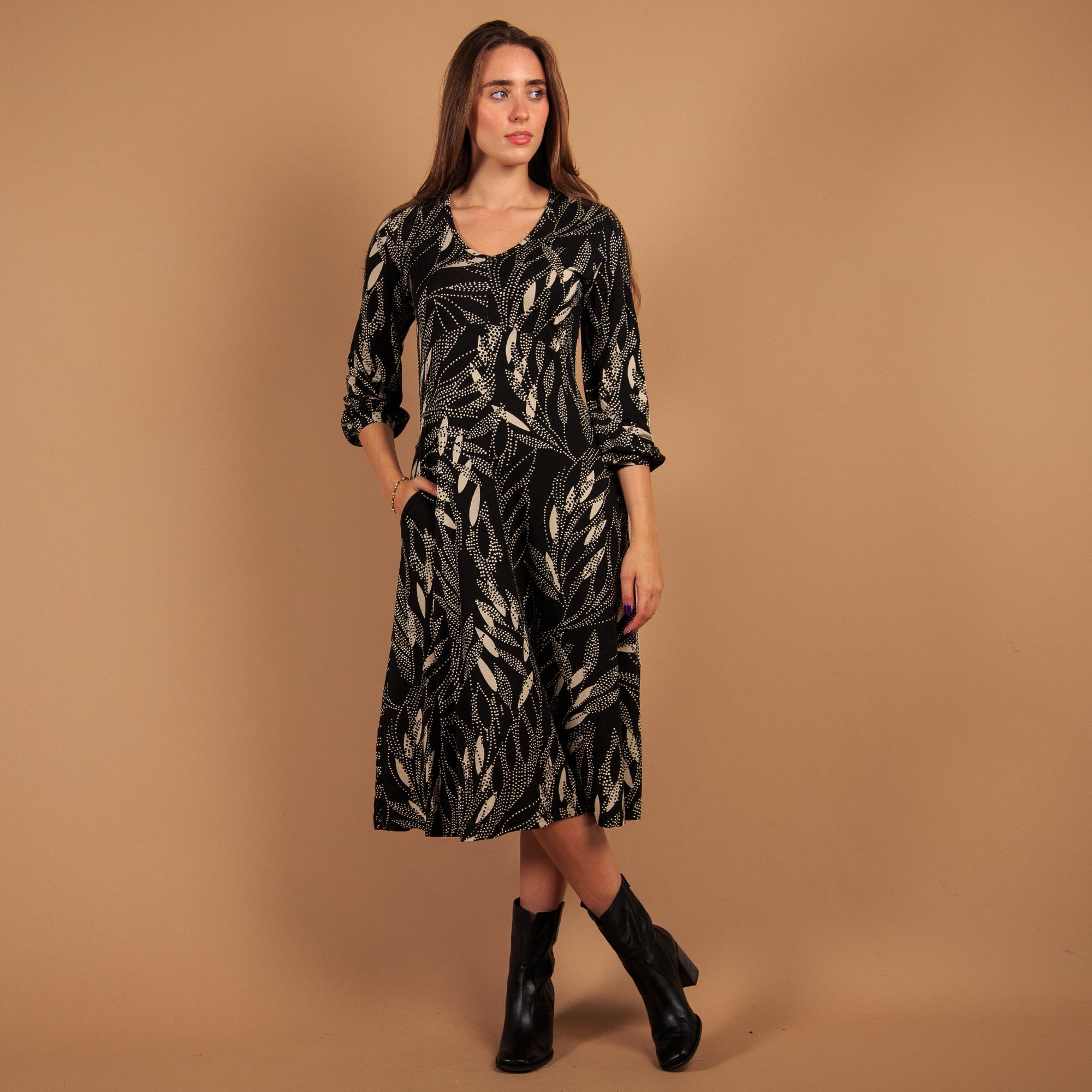 Pomodoro Spot Leaf Print Midi Jersey Dress Black/ecru