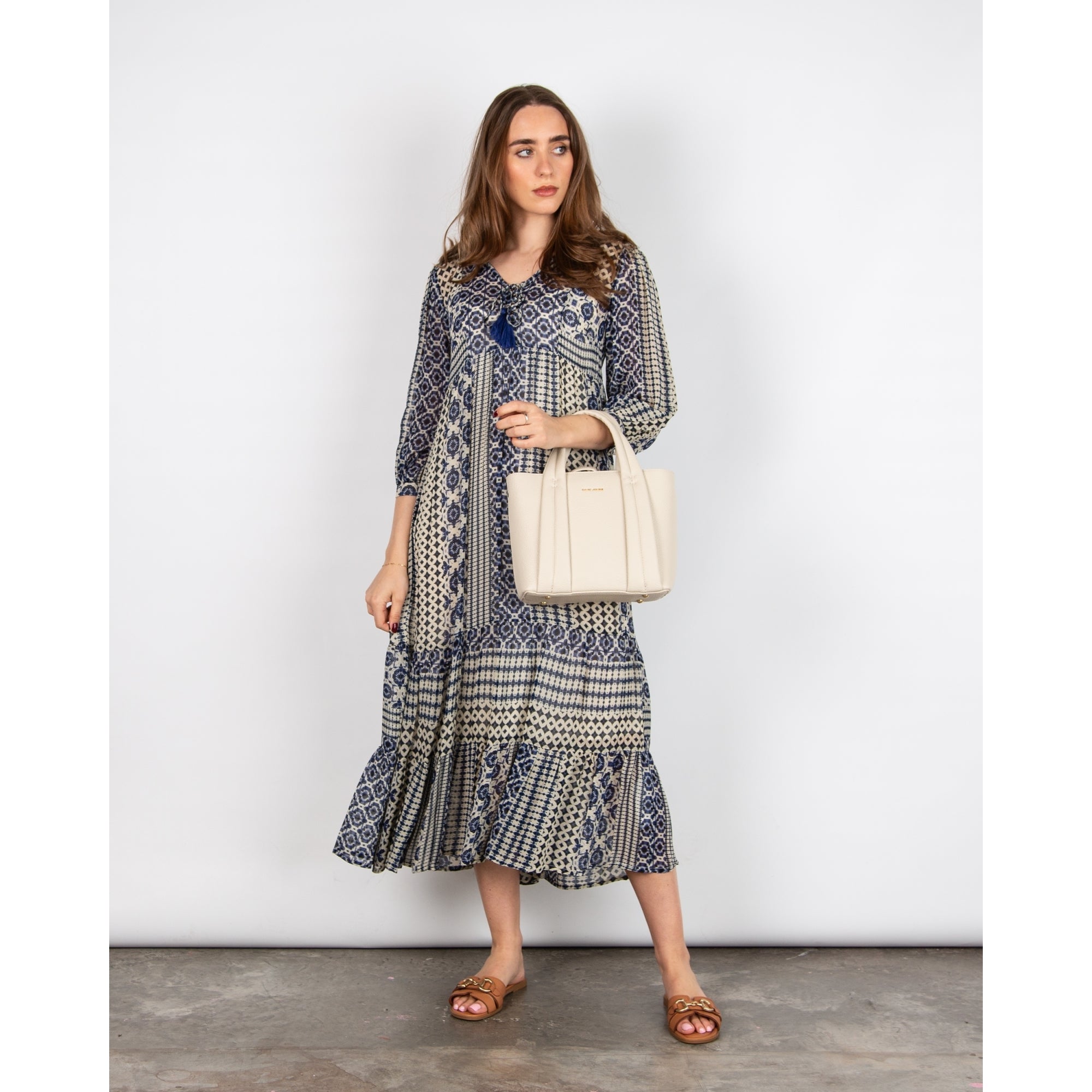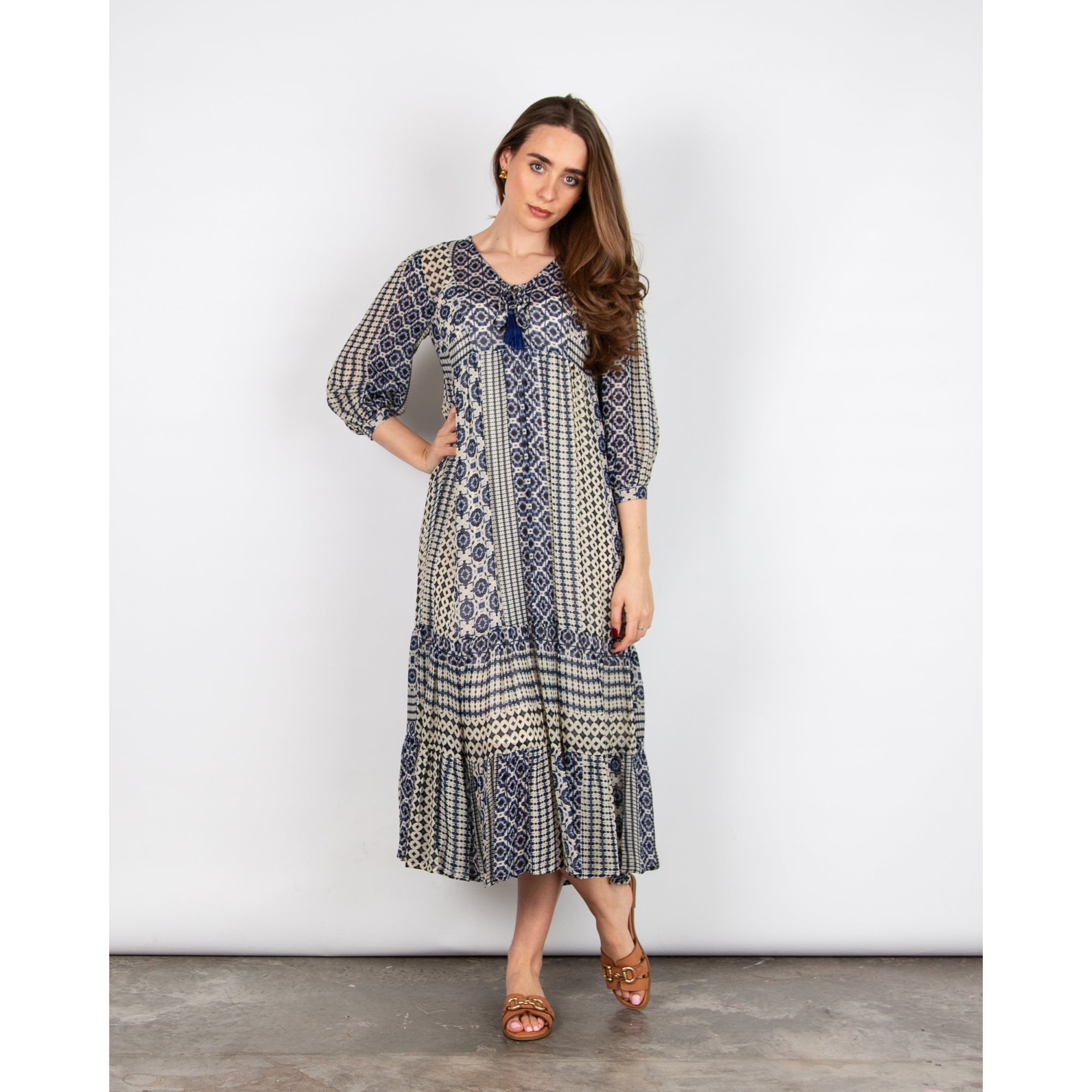 Pomodoro V Neck Circle Ethnic Stripe Tiered Hem Dress Blue/ecru