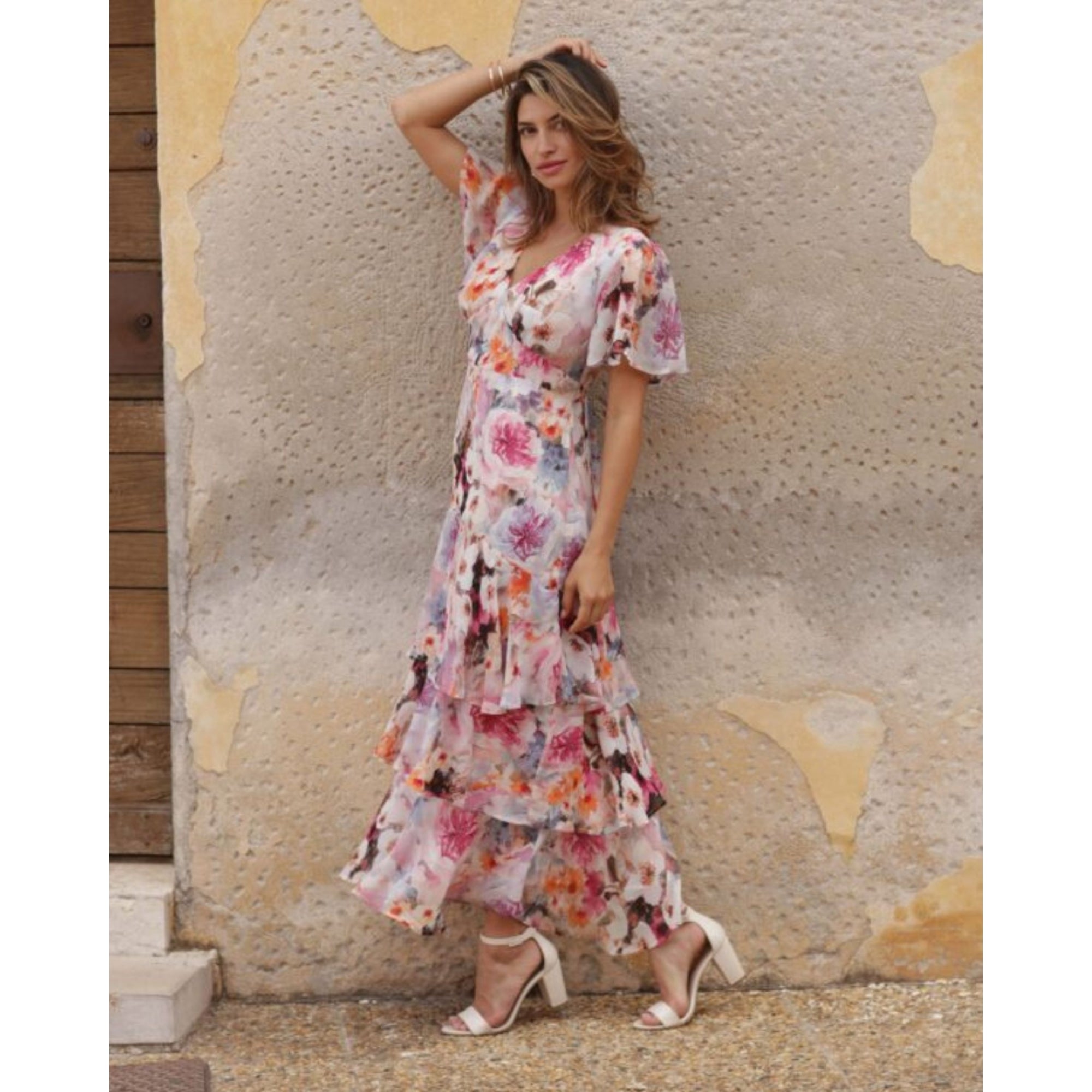 Pomodoro Watercolour Floral Tiered Maxi Dress Pink