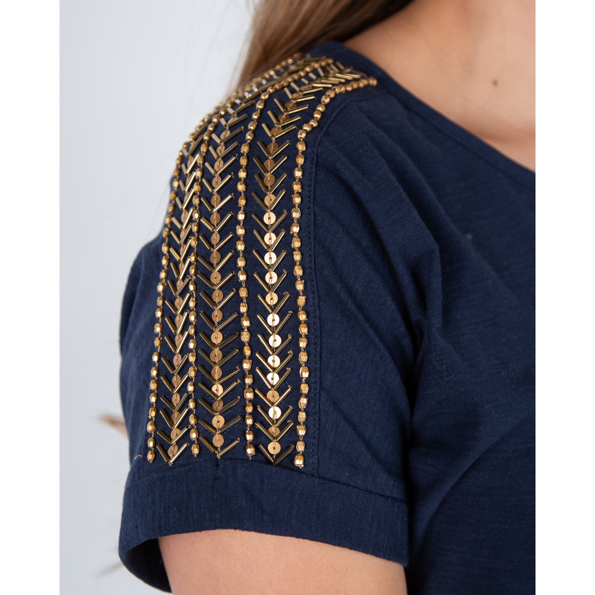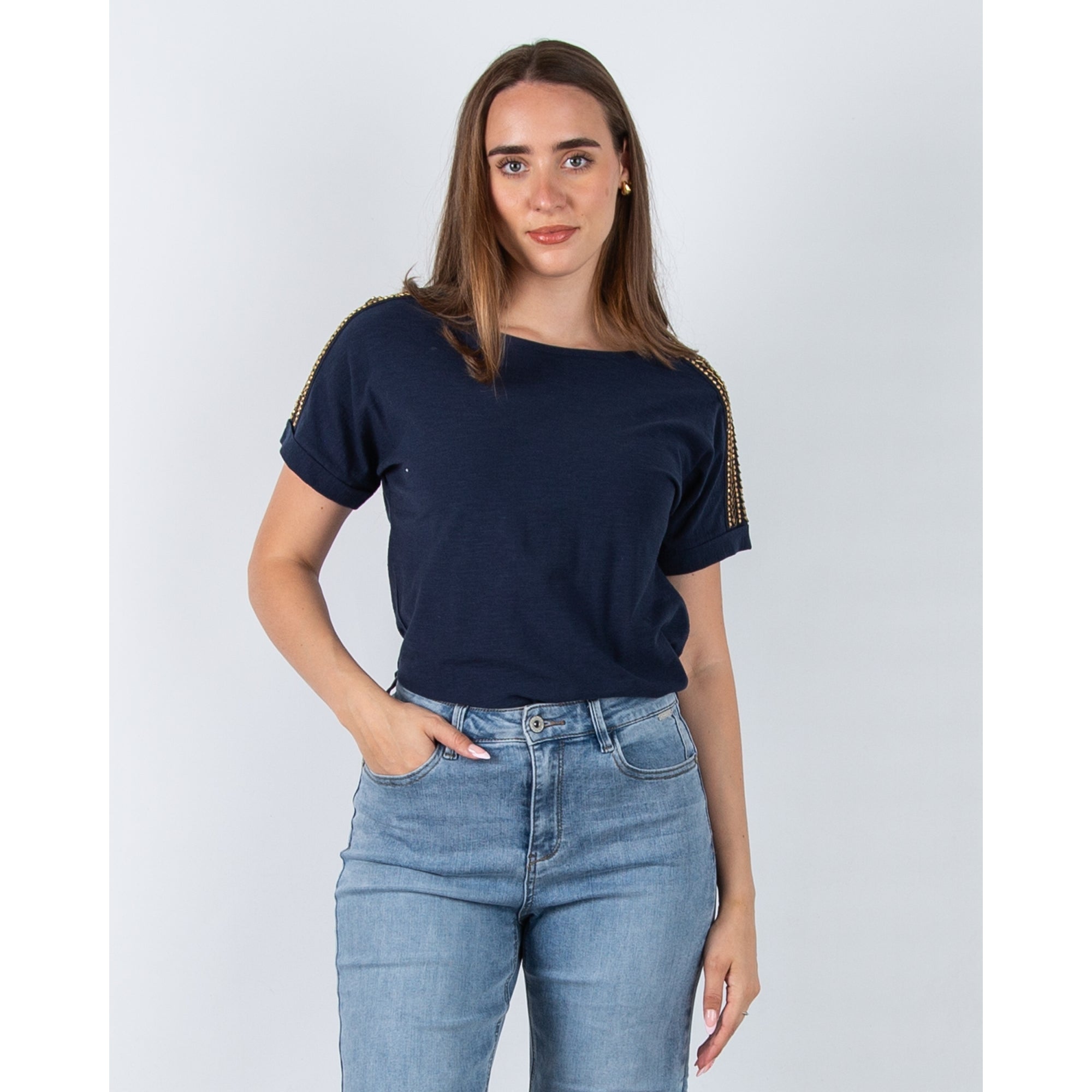 Pomodoro Round Neck T-shirt With Embellished Sleeves Navy