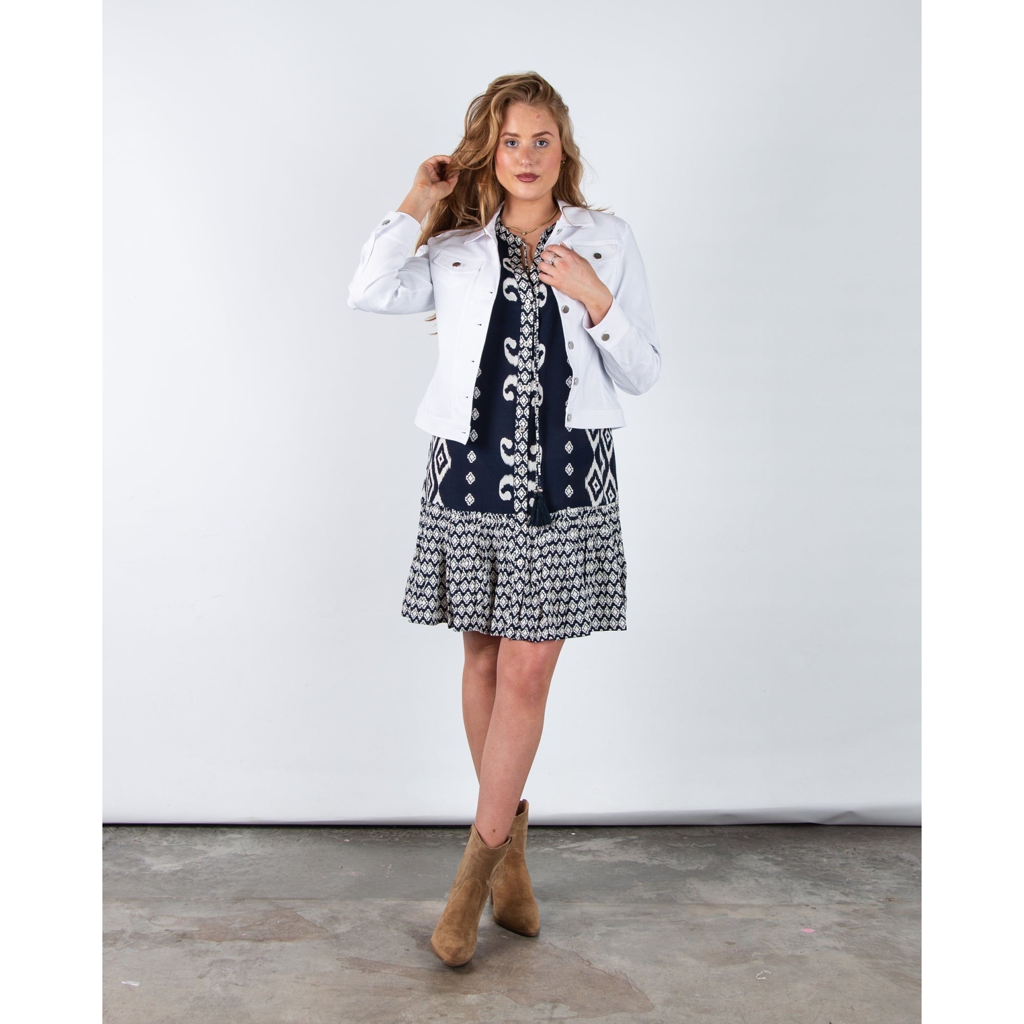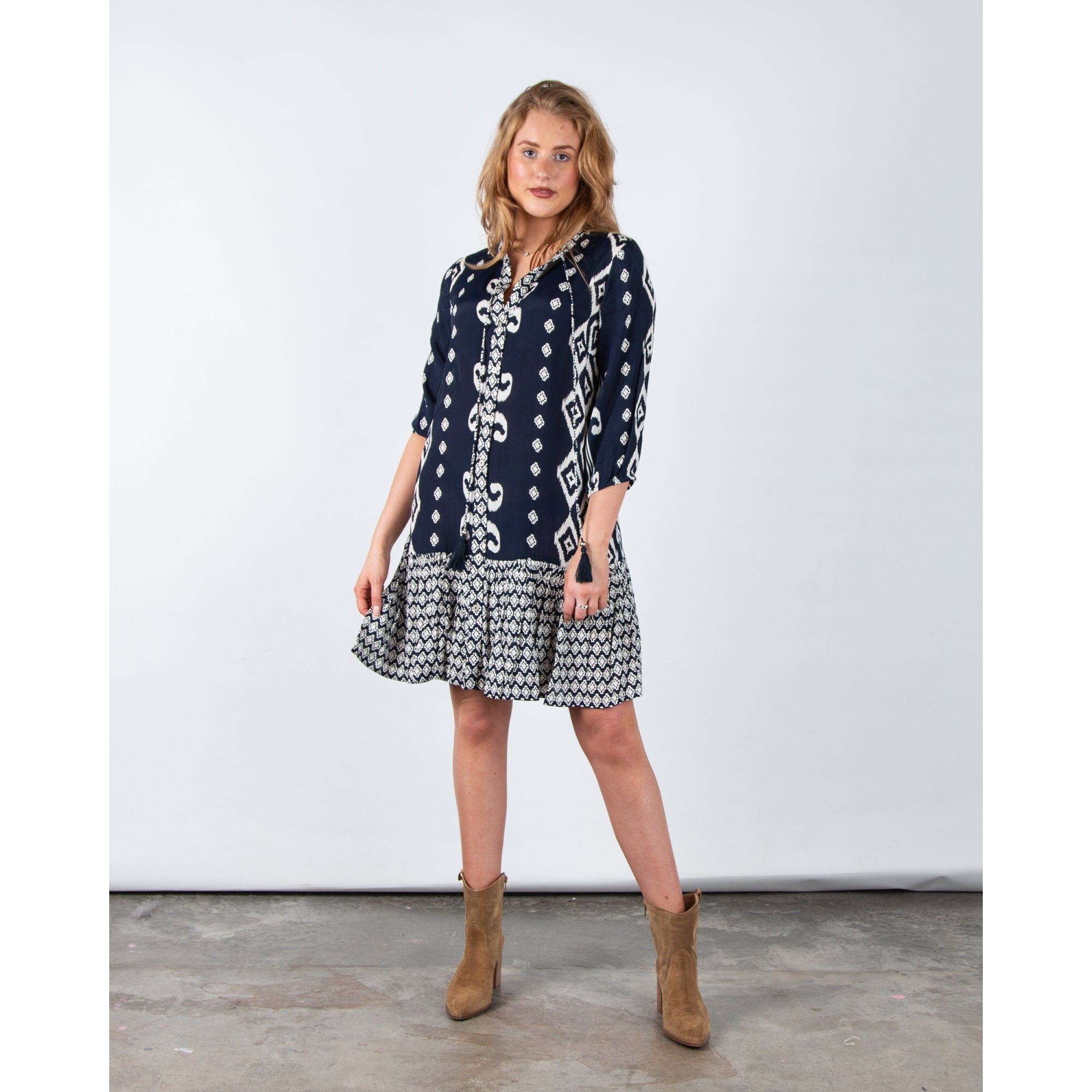Pomodoro Tie Neck Ikat Print Shift Dress With Tiered Hem Navy/white