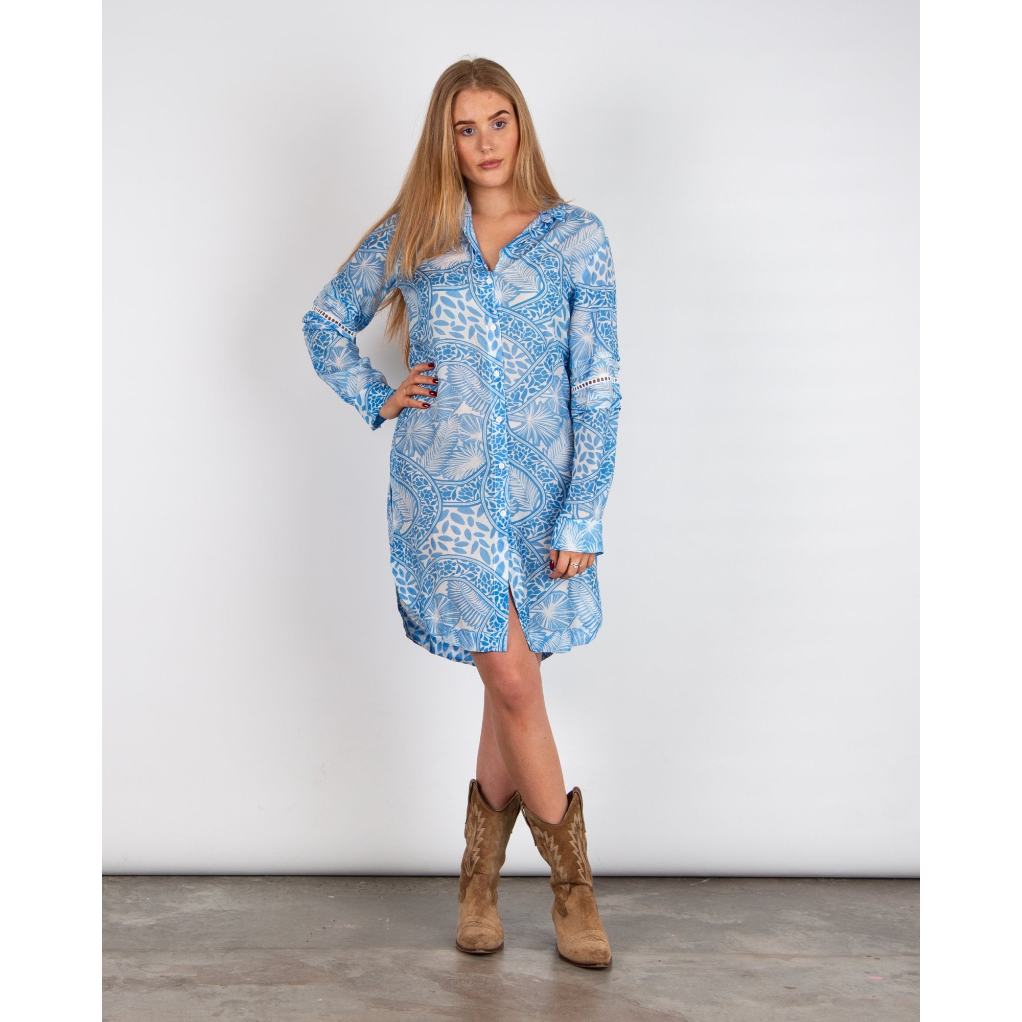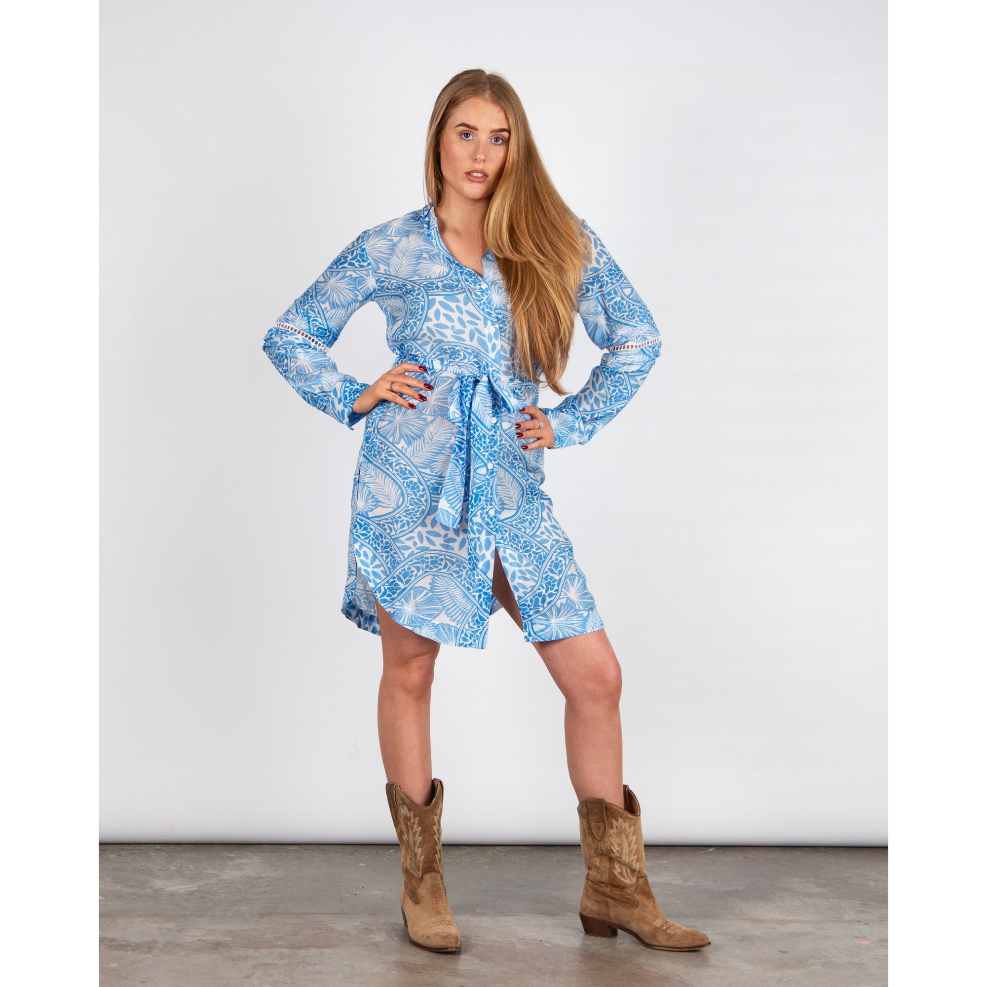 Pranella Uno Palm Print Oversized Belted Shirt Dress Blue/white