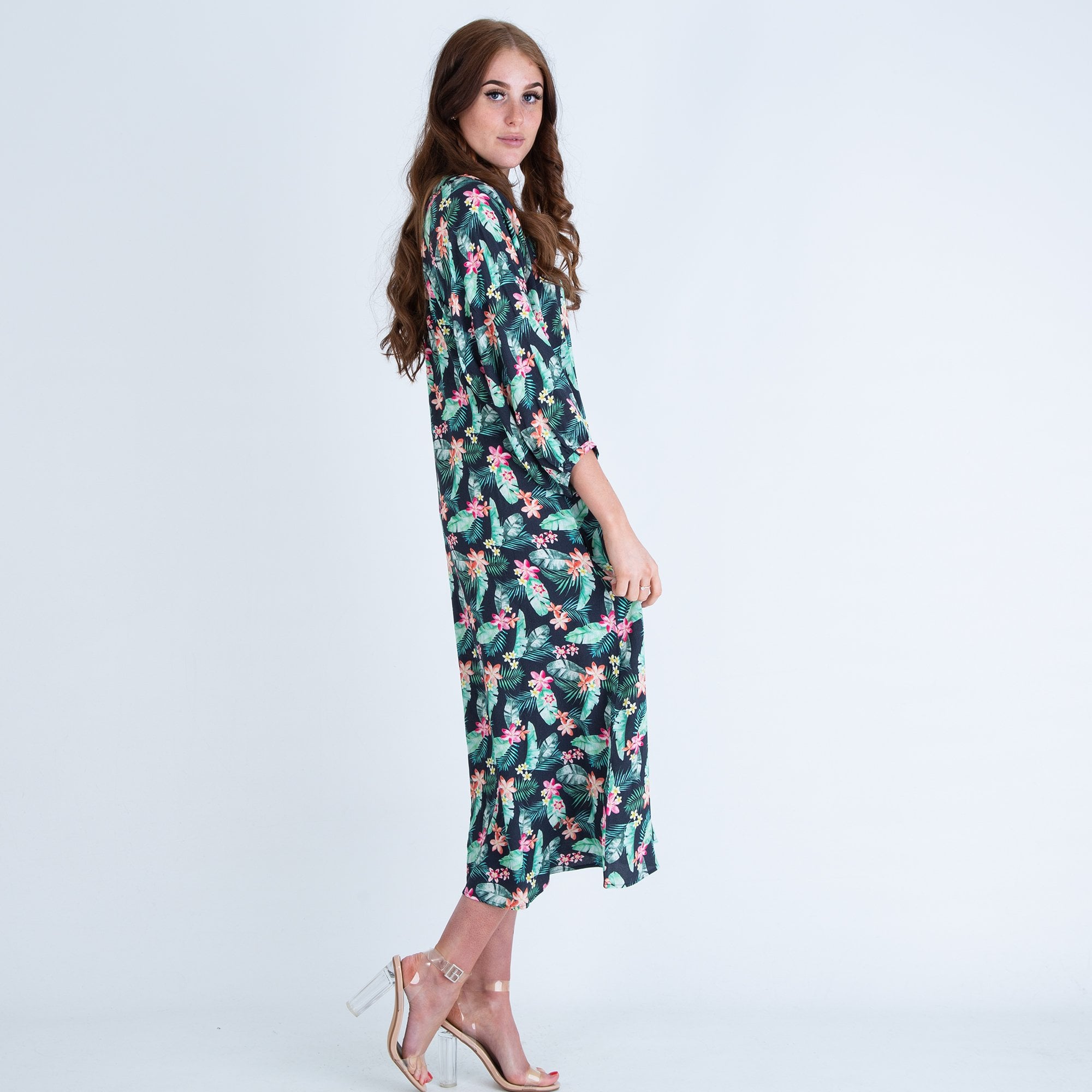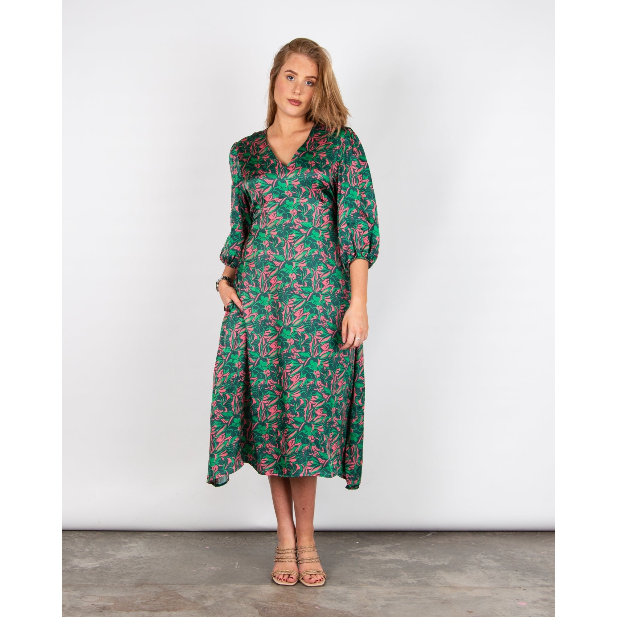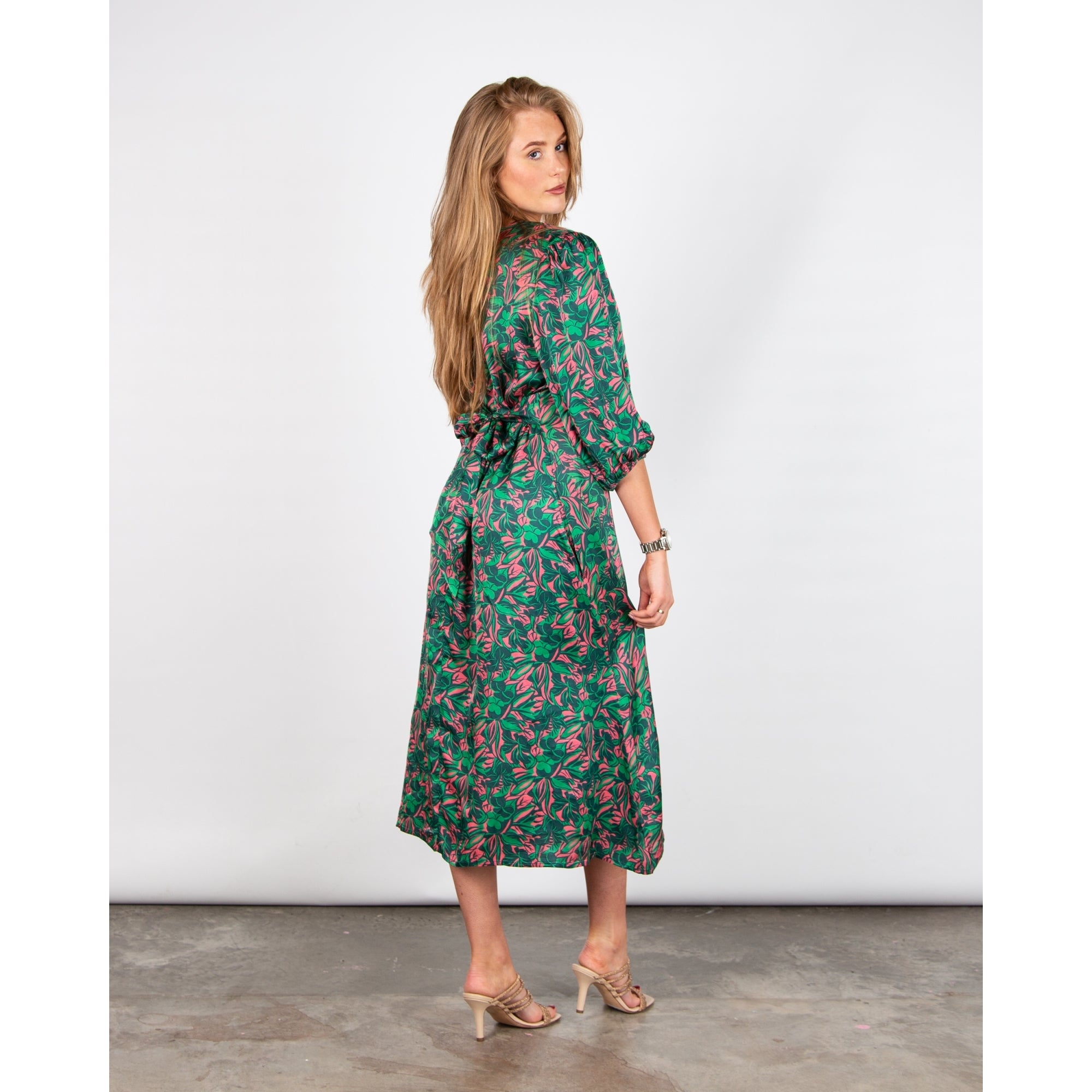Primrose Park Maggie V Neck Tie Back Contrast Leaf Print Dress Green/pink