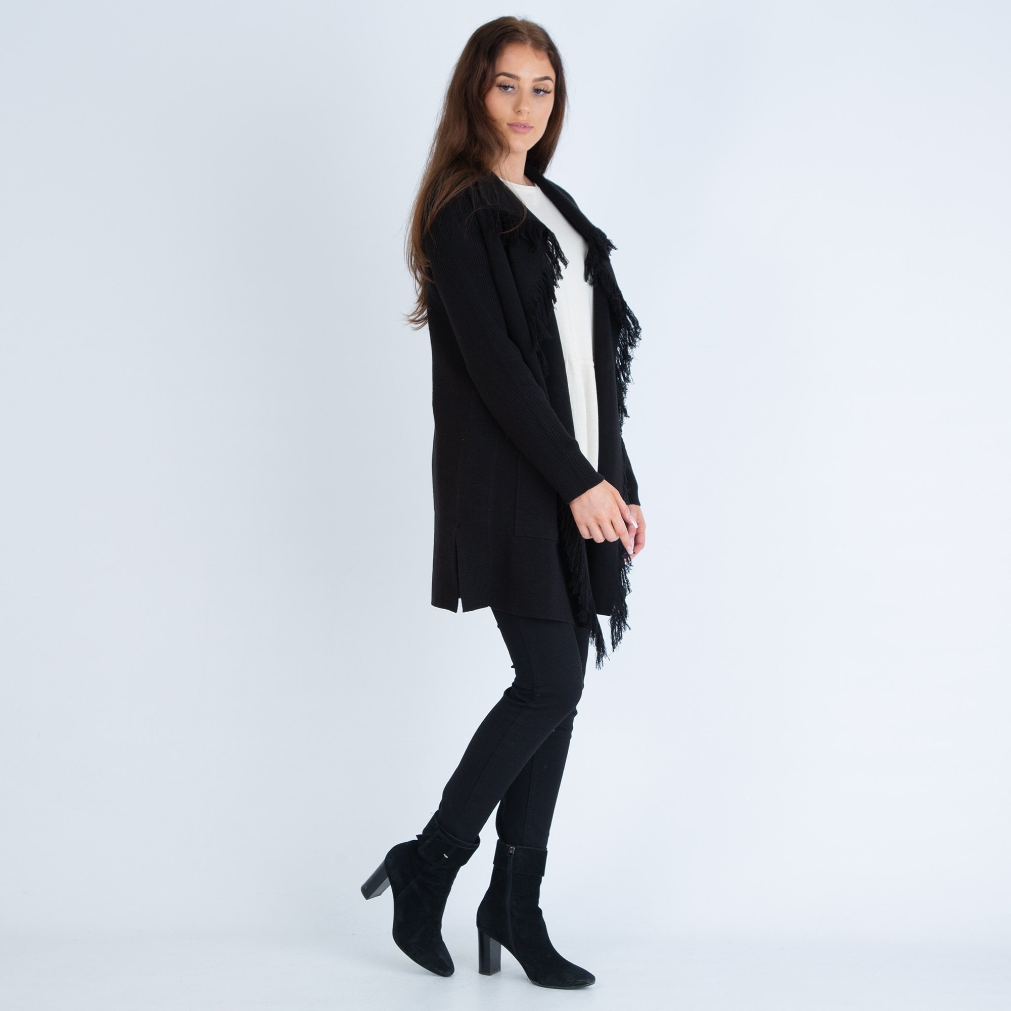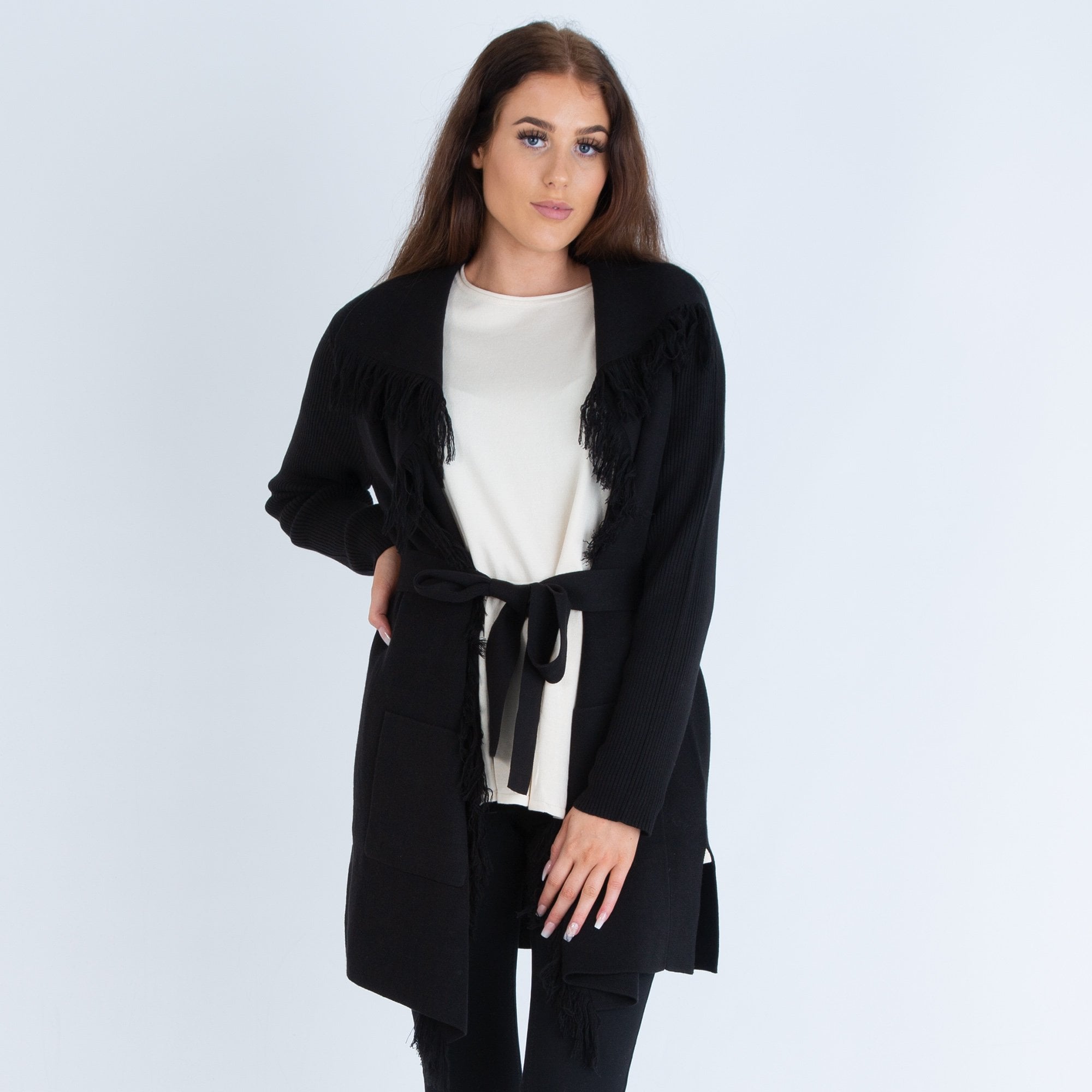 Repeat Waterfall Fringed Edge Cardigan Black & Tan
