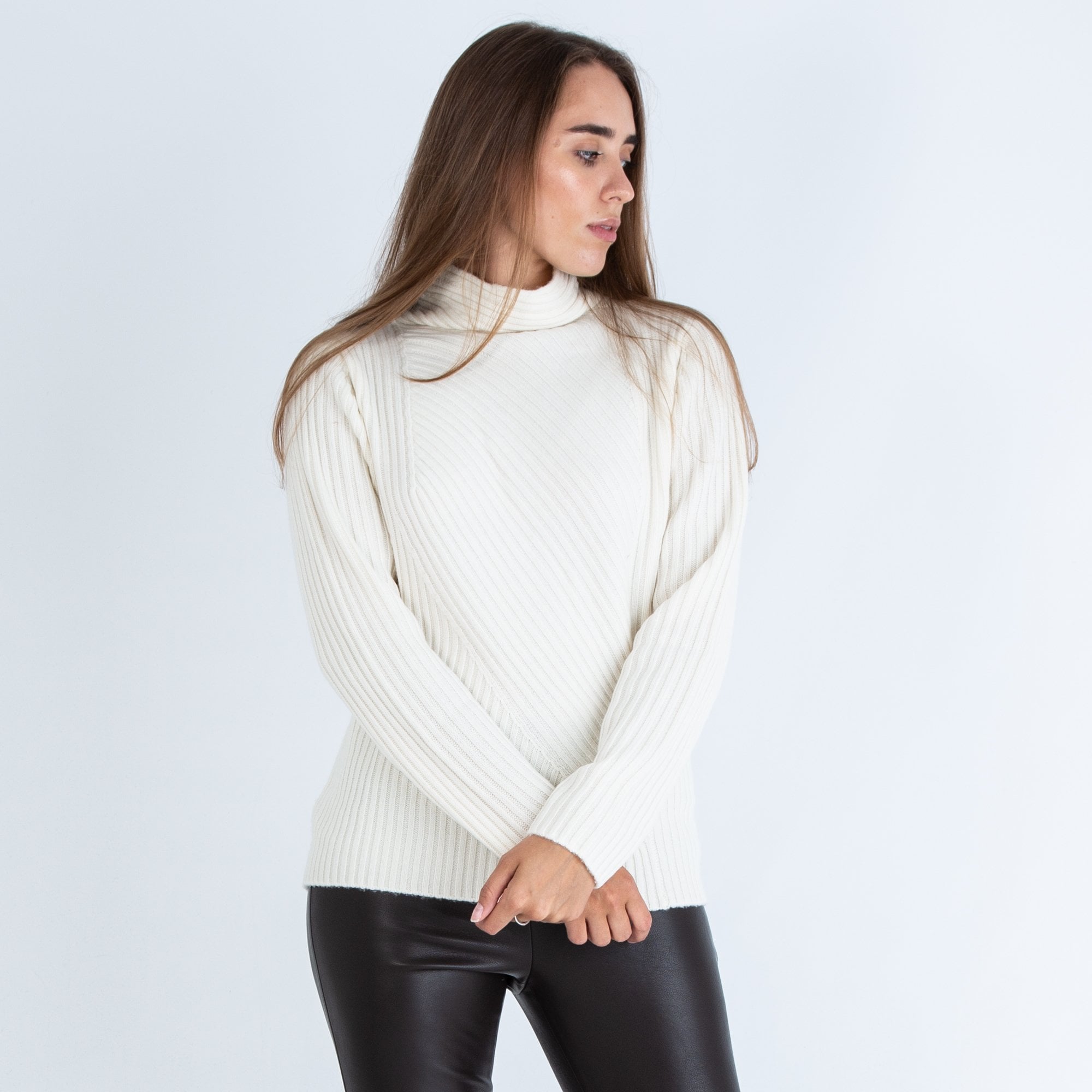 Repeat Cashmere Ribbed Funnel Neck Jumper Cream