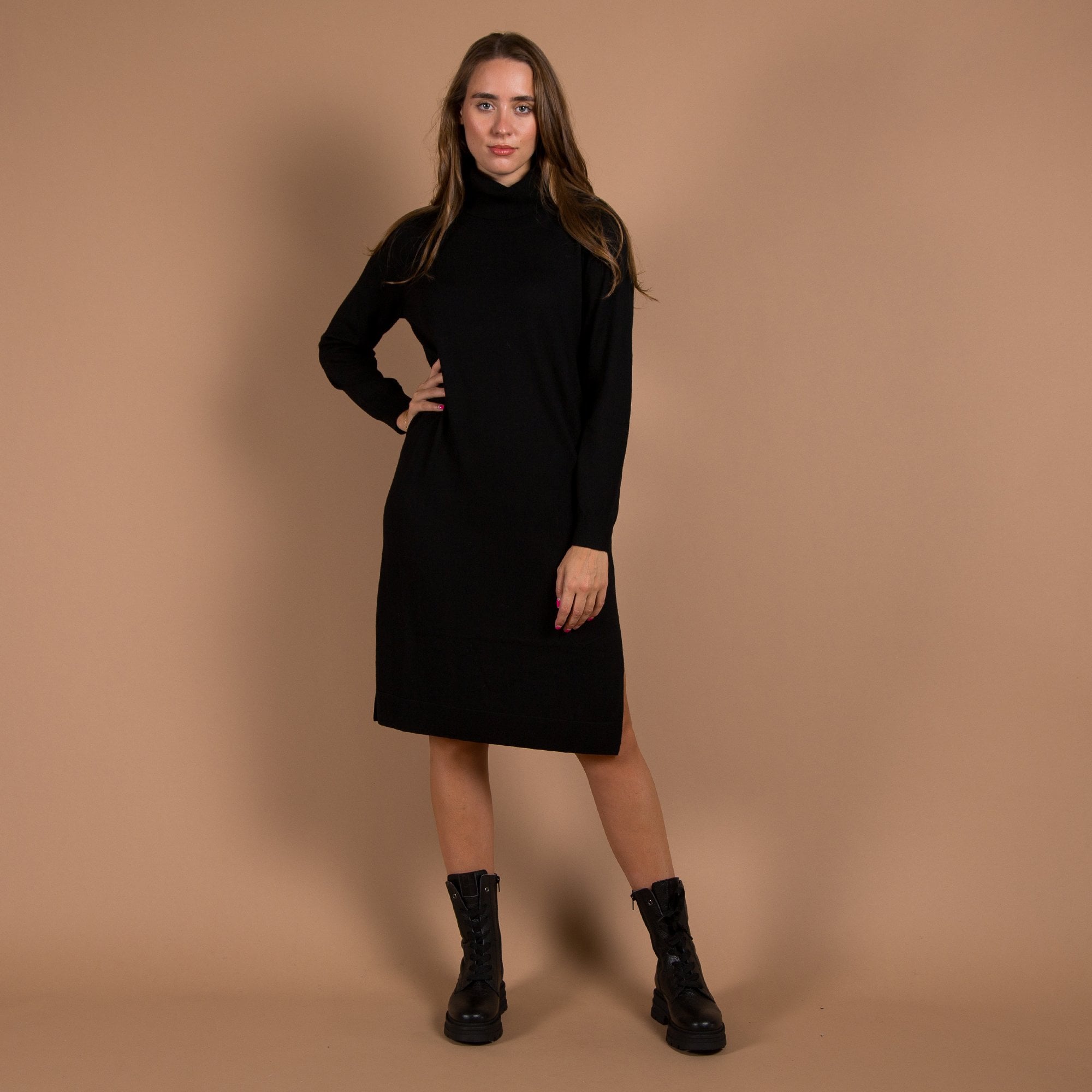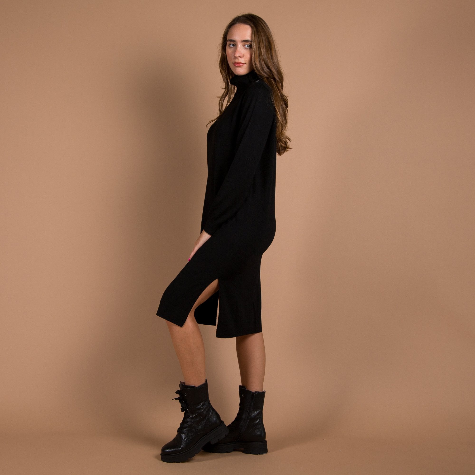 Repeat Cashmere Button Roll Neck Knit Midi Dress Black