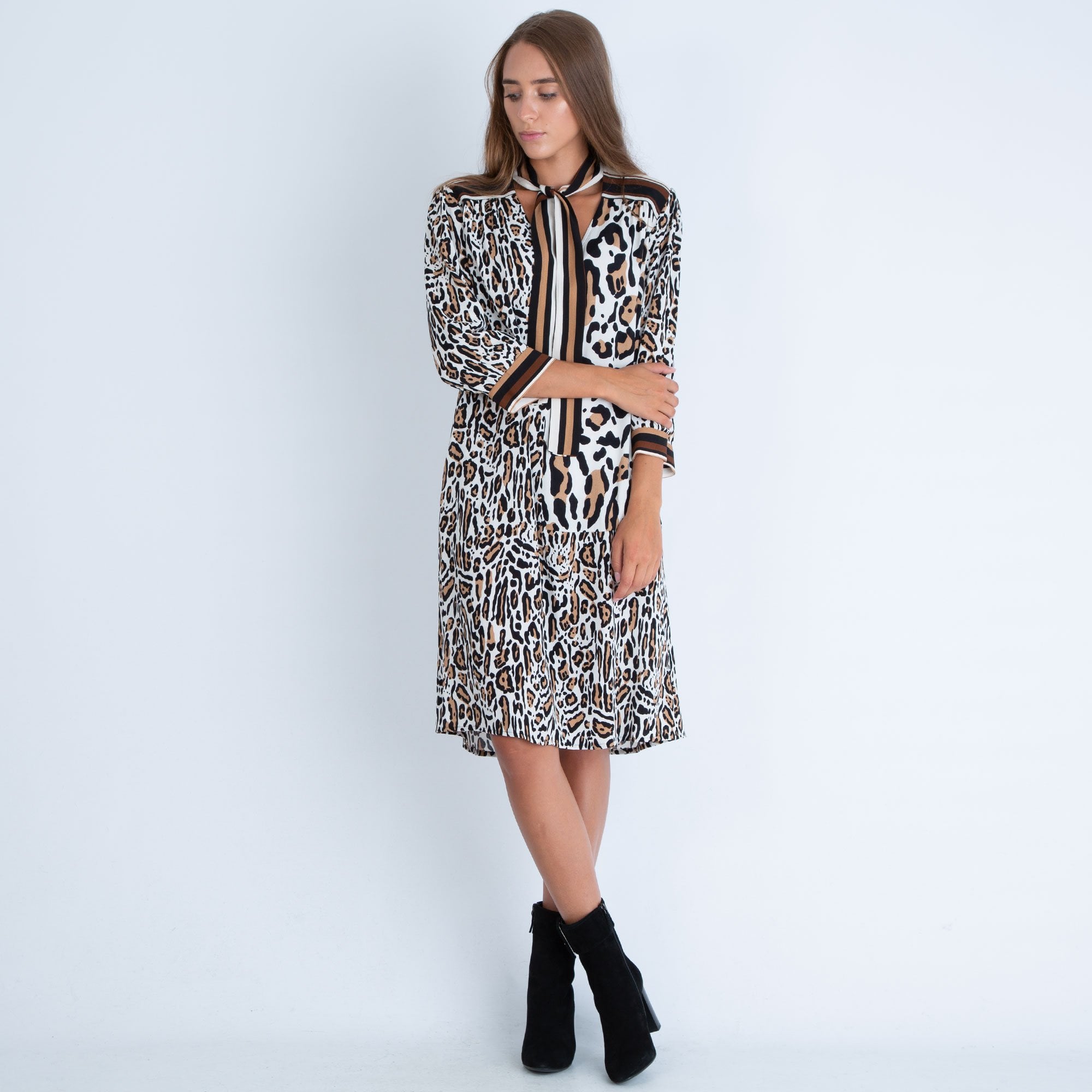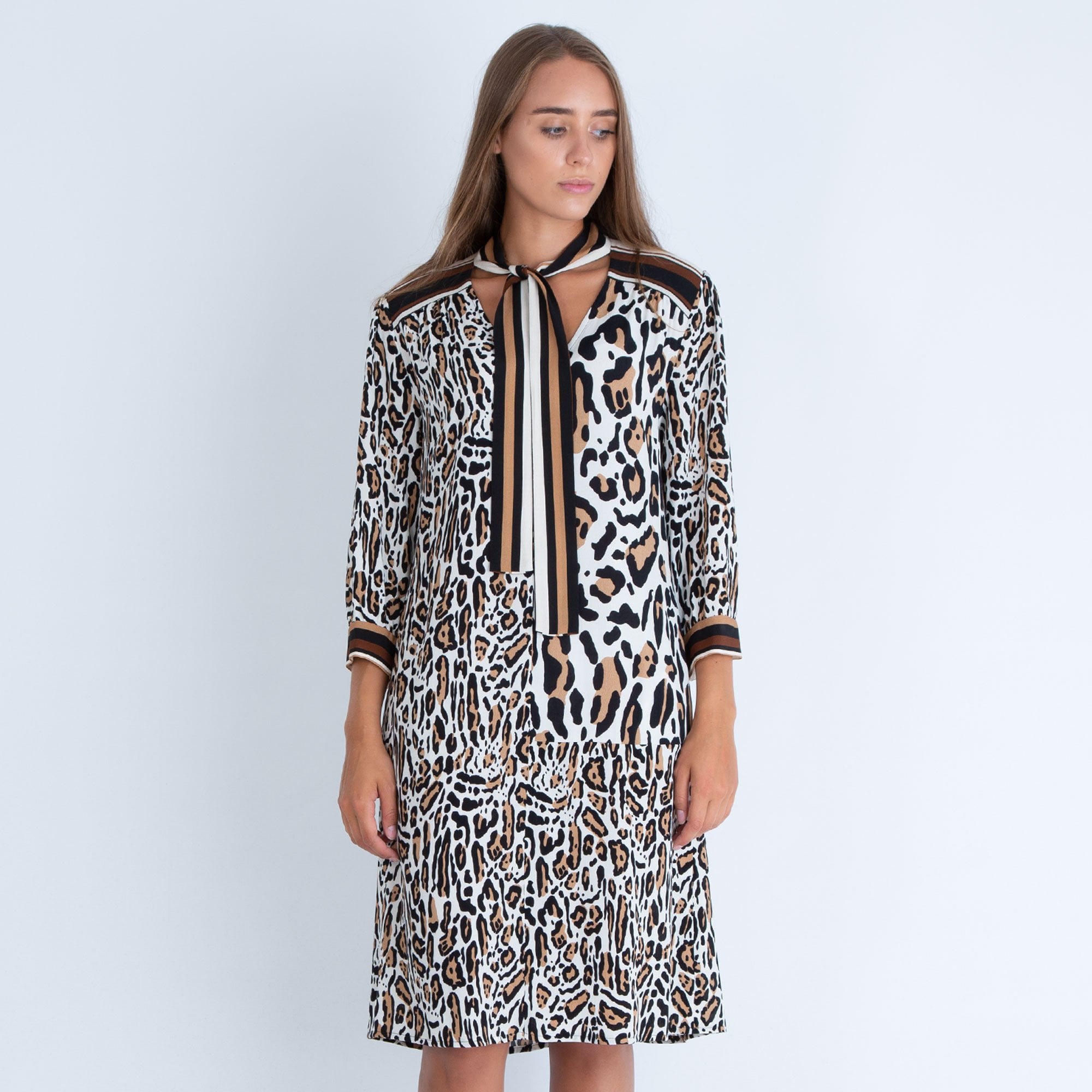 Riani V Neck Leopard Print Dress With Tie Neck Multi