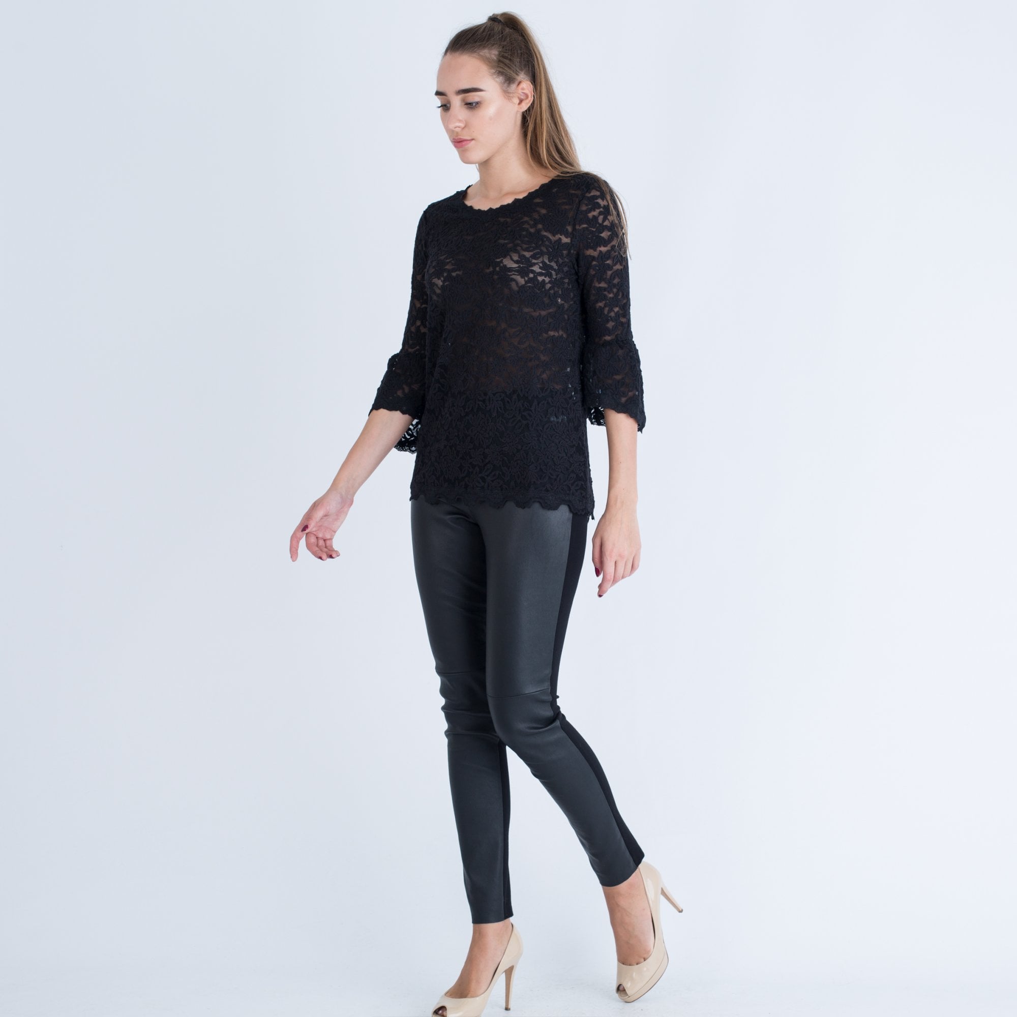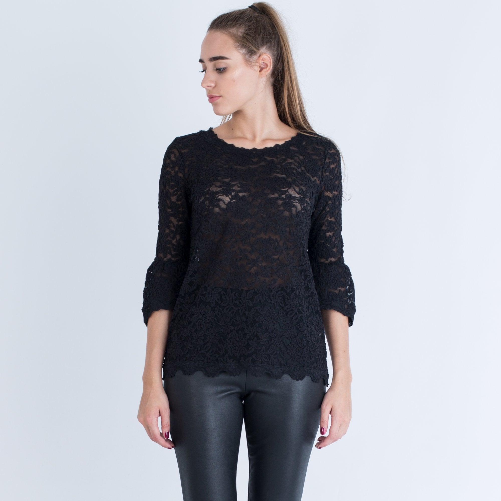 Rosemunde Lace A Line Top With 3/4 Gathered Sleeve Black