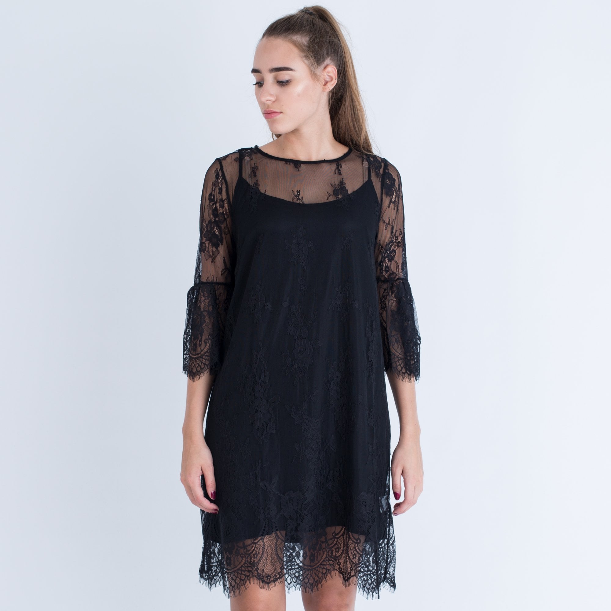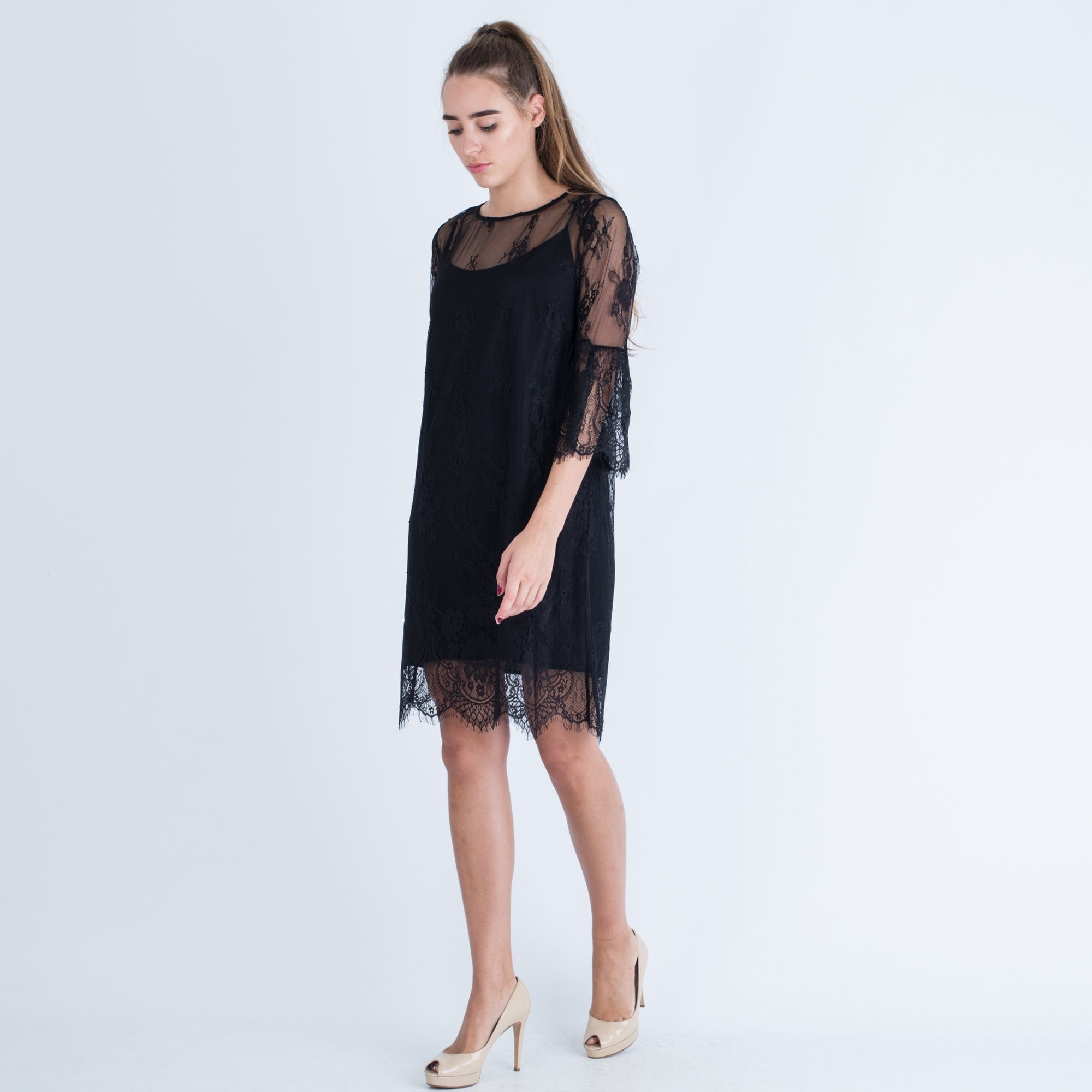 Rosemunde Delicate Fine Lace Dress With 3/4 Gathered Sleeve Black