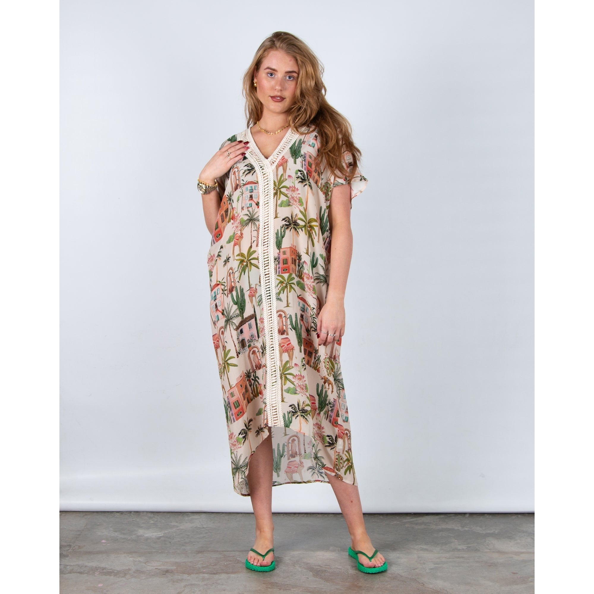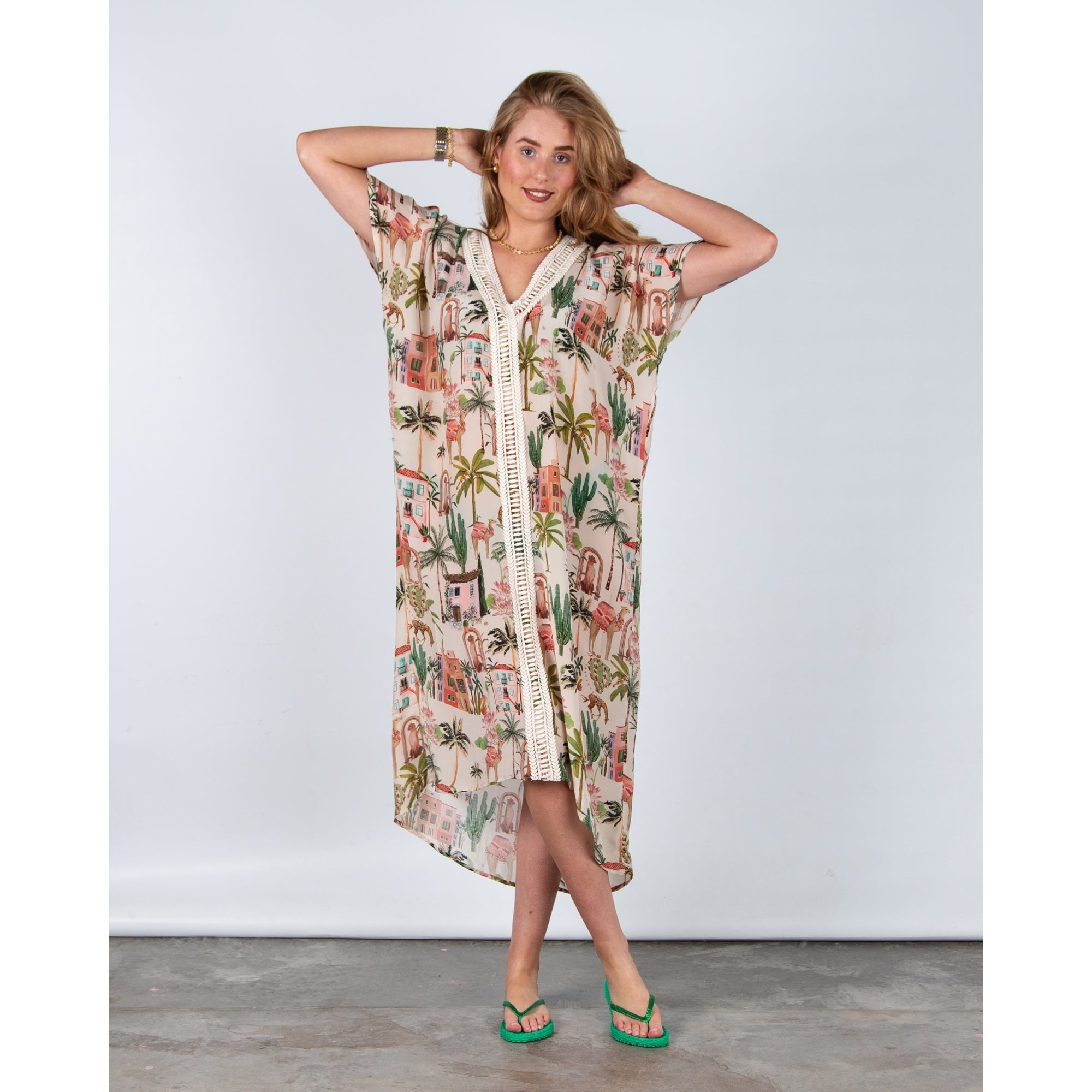 Stella Moretti Aza Palm Tree Print V Neck Kaftan With Lace Trim Morrocan Mule