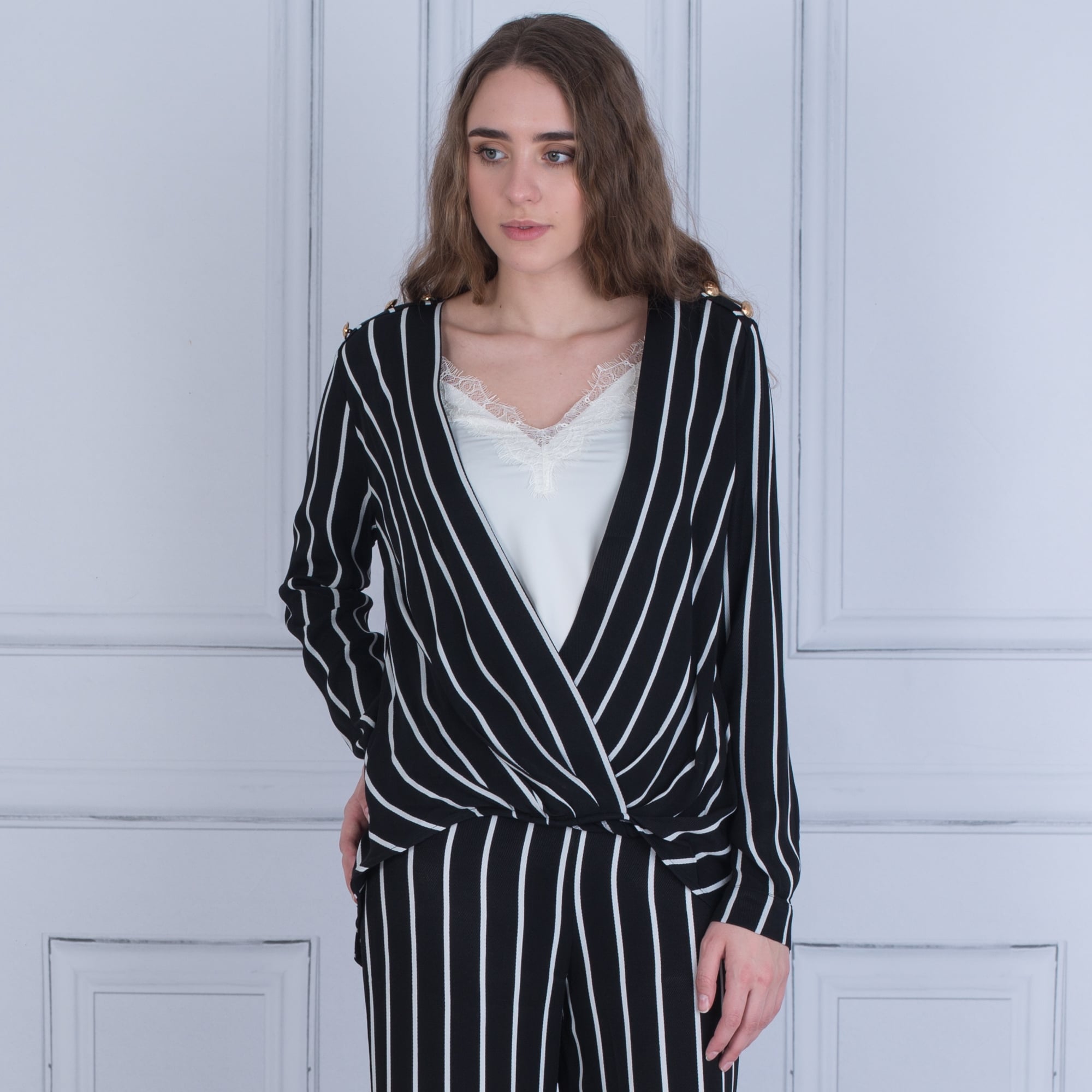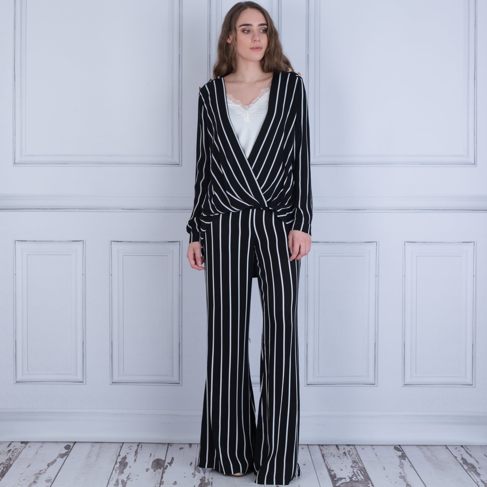 Forever Unique Angel Wrap Front Stripe Dip Back Blouse Black/White