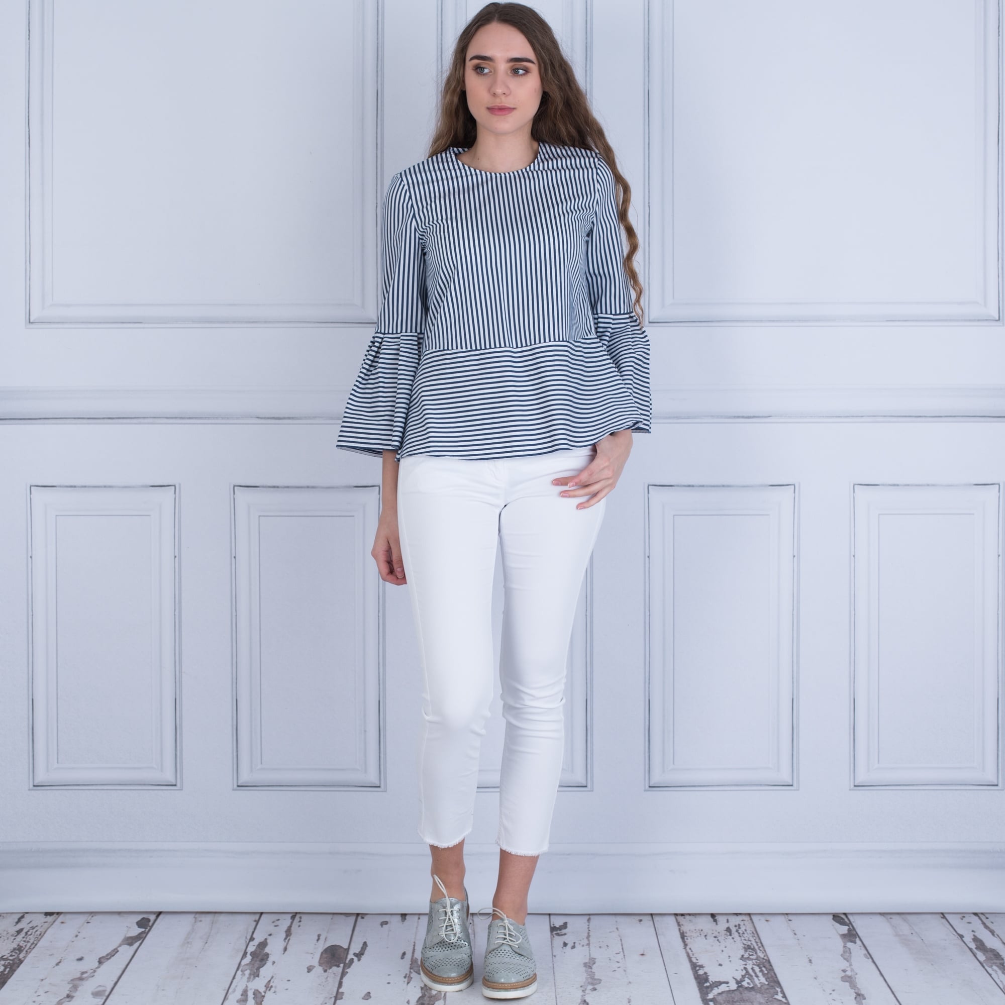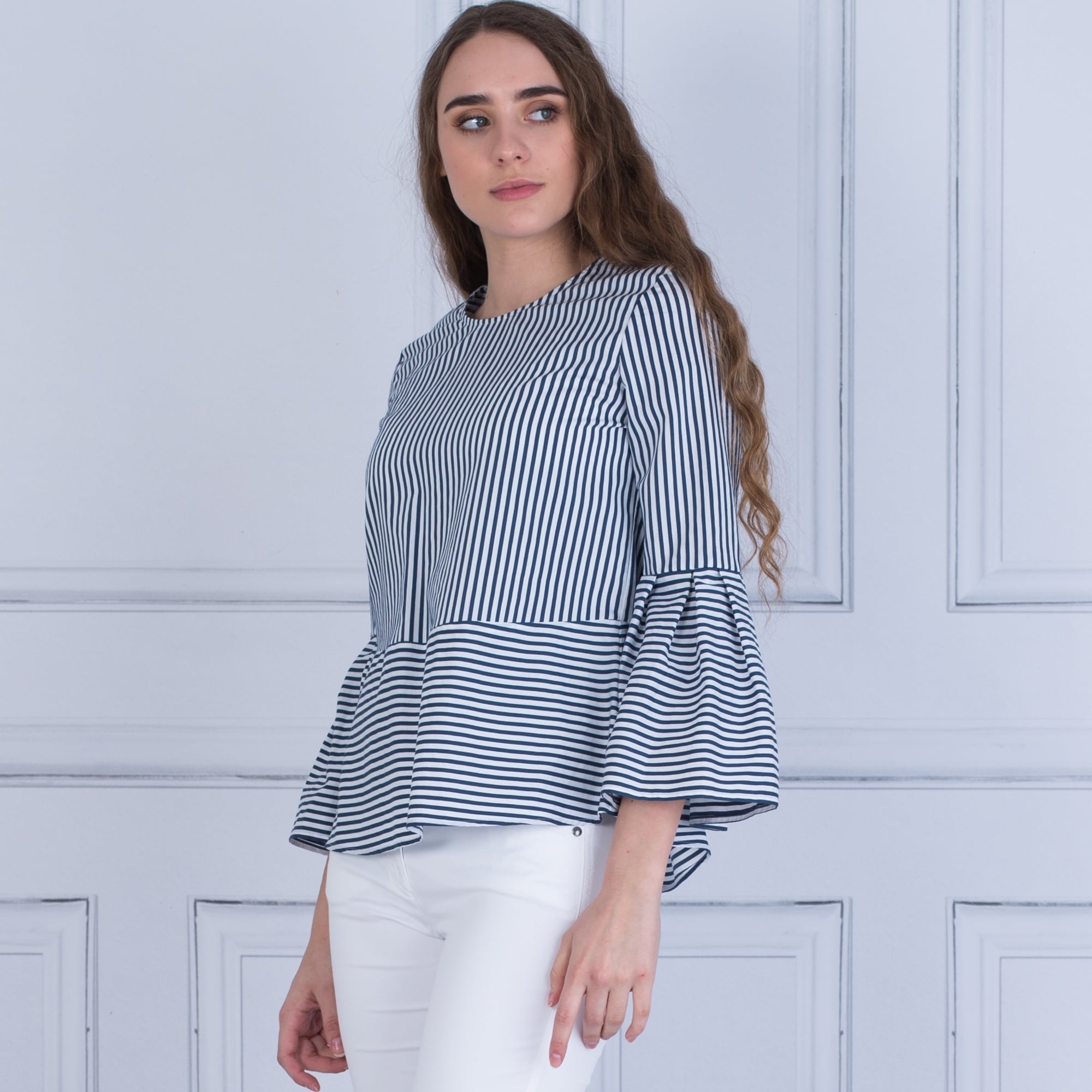 Luisa Cerano Stripe Flute Sleeve Blouse French Navy/White