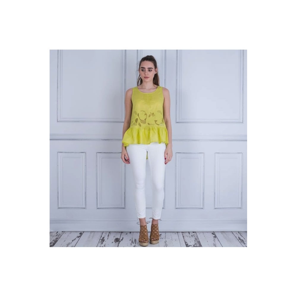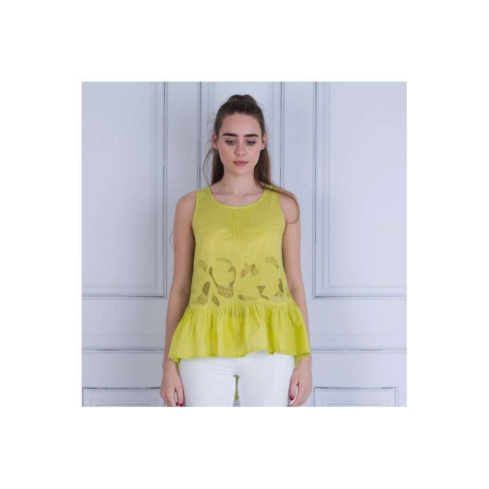 Marc Cain Scoop Neck Sleeveless Frill Hem Embroidered Top Lime