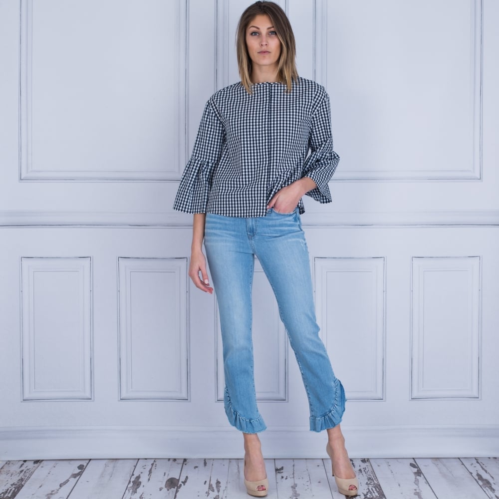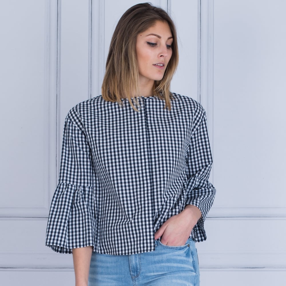 Luisa Cerano Gingham Blouse With Gathered Flute Sleeve Navy