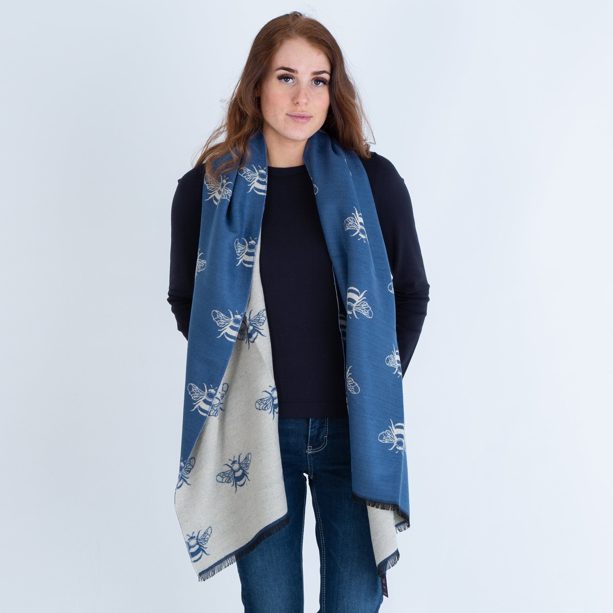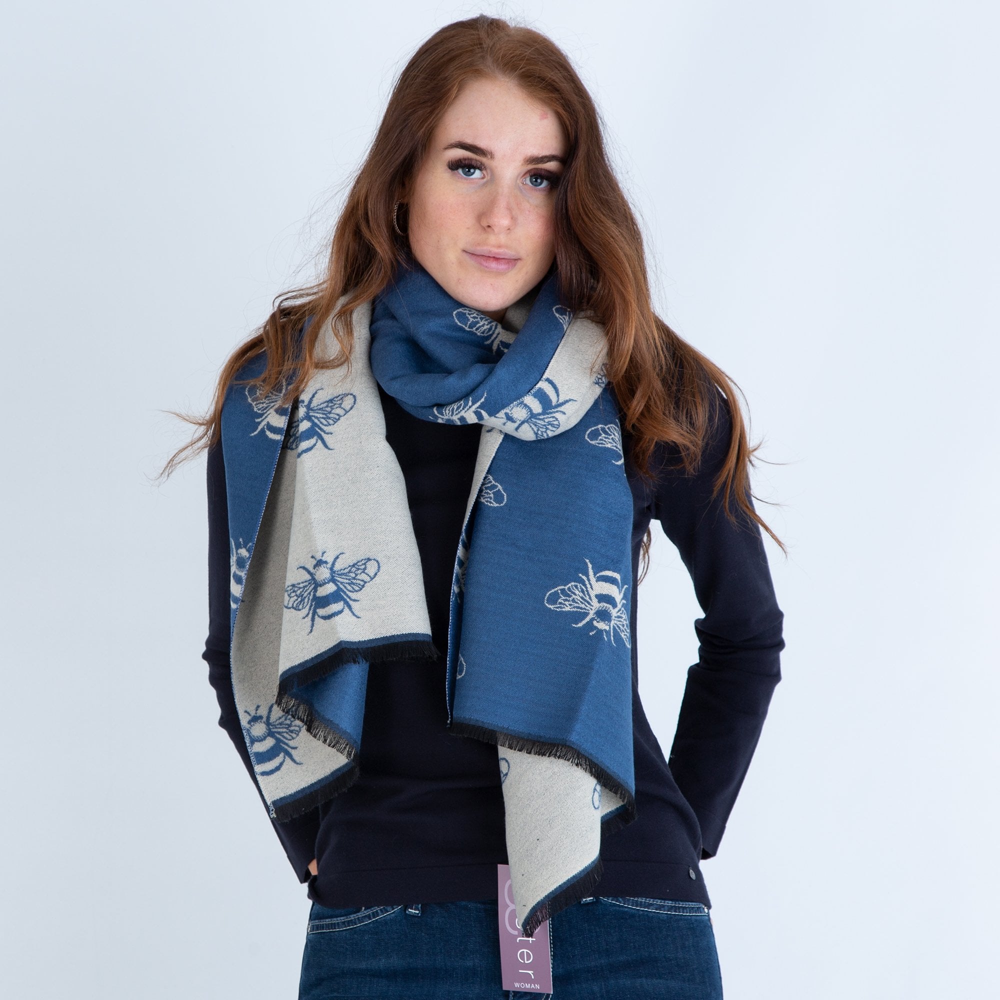Sister PR Reversible Bee Print Wool Scarf Blue/ecru