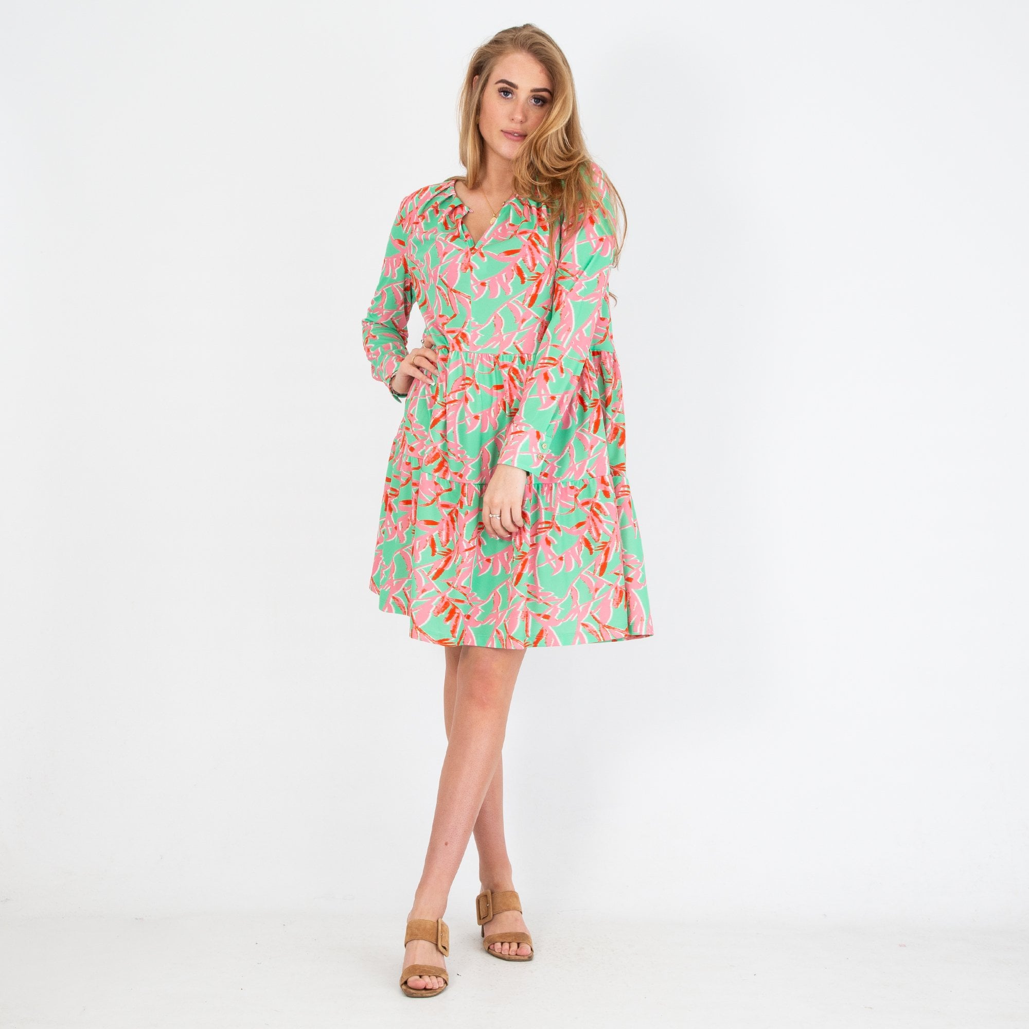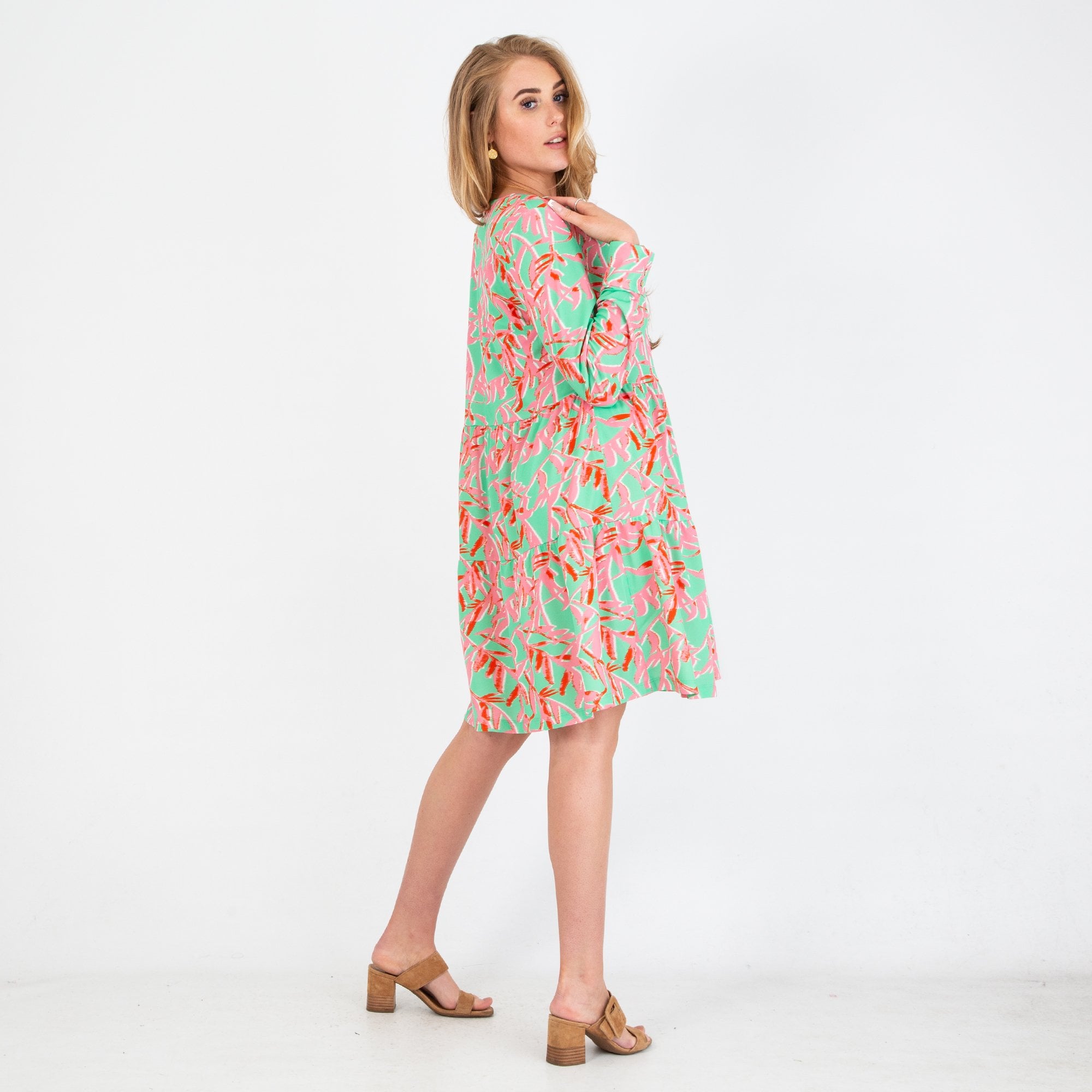 Marc Cain Leaf Print Tiered Button Neck Dress Green/coral