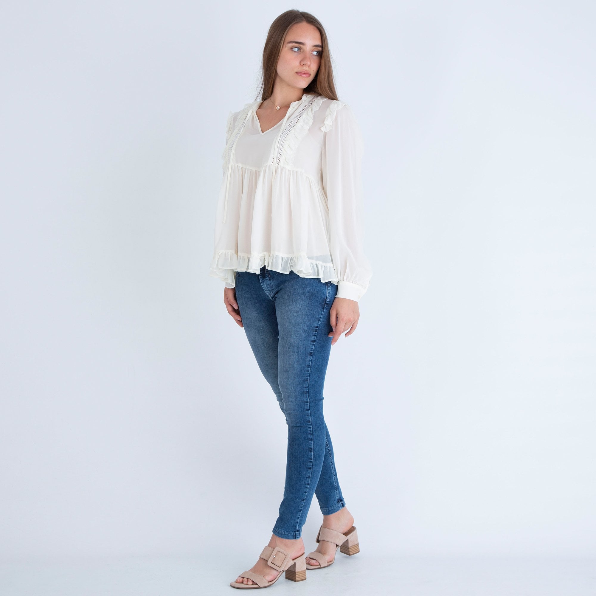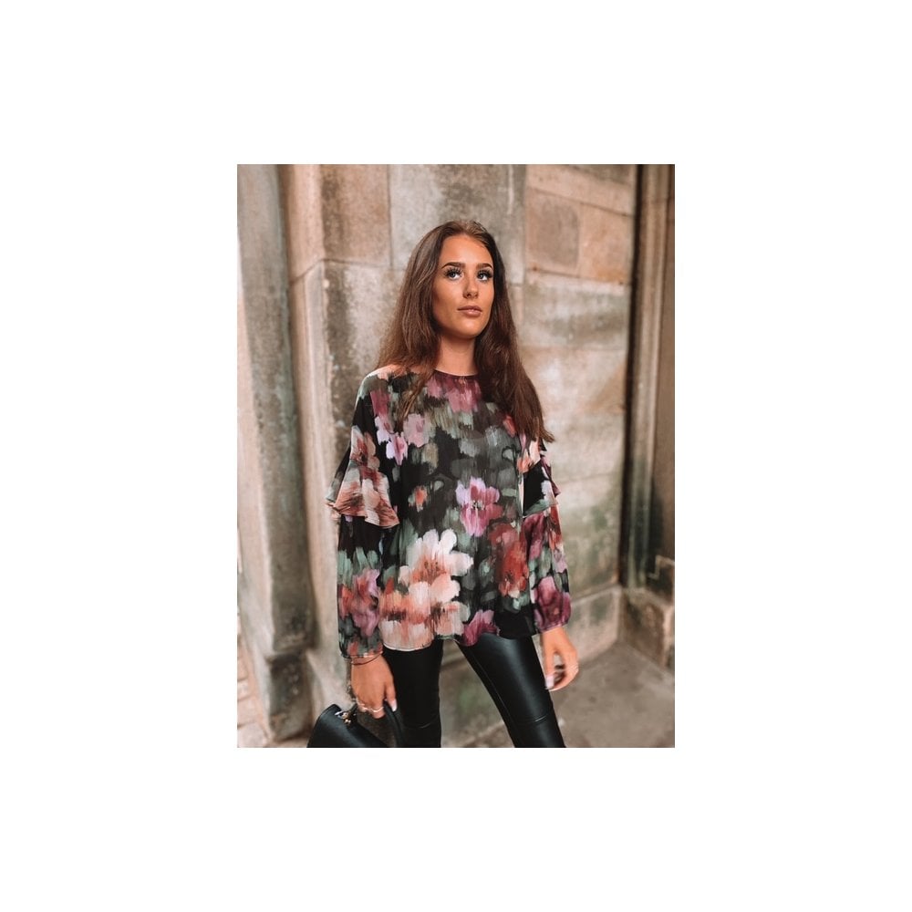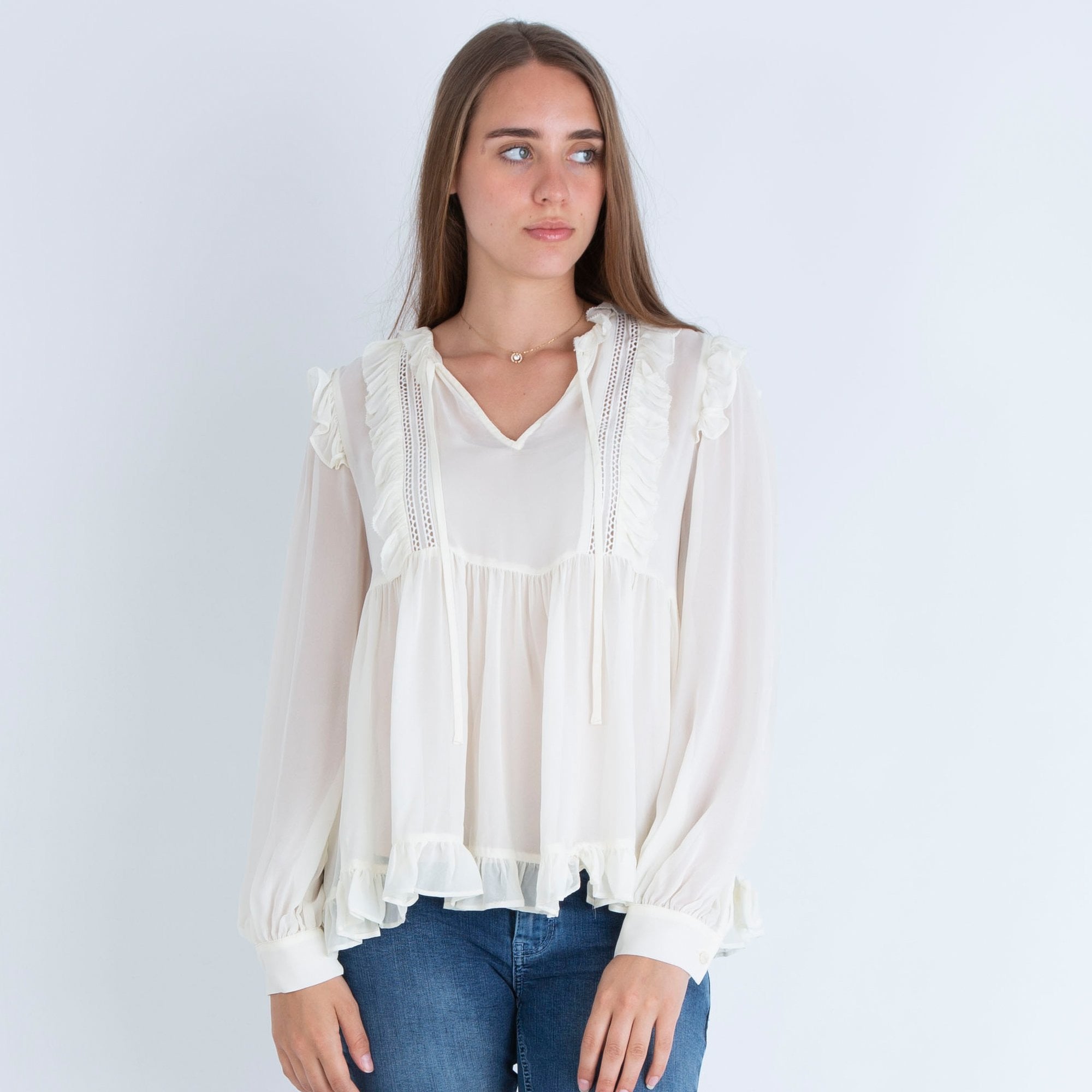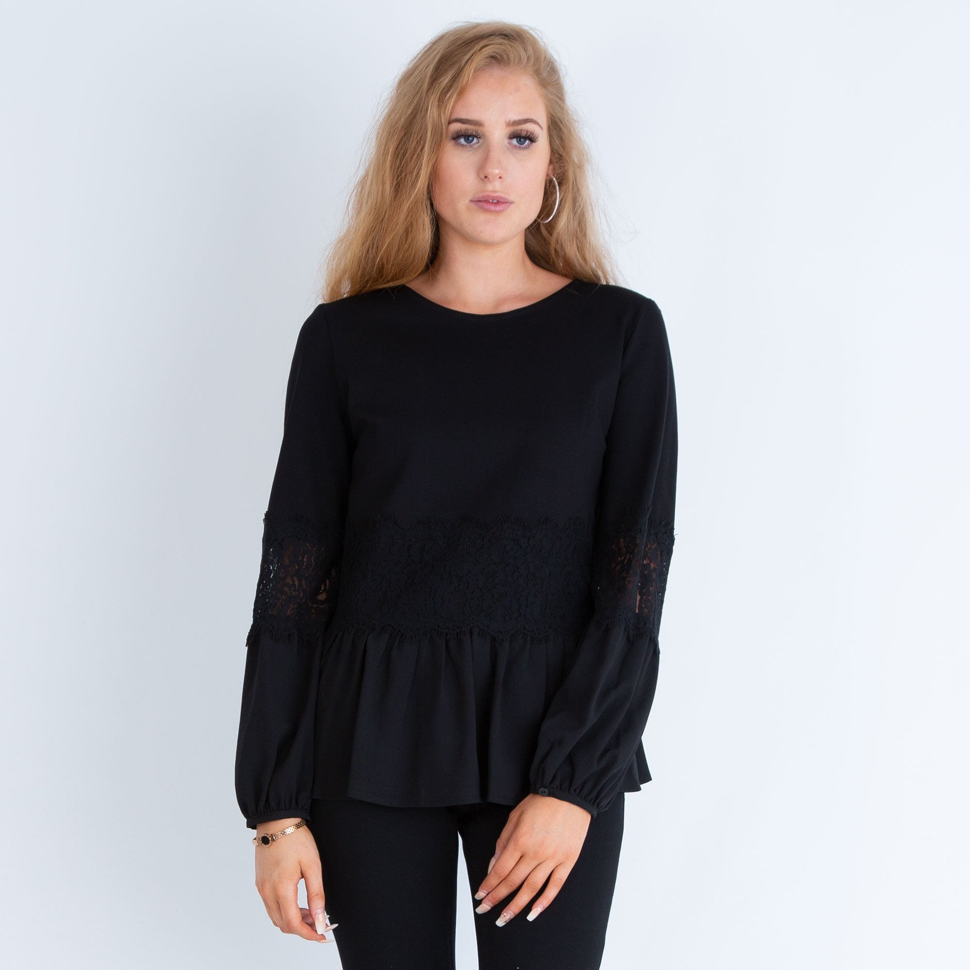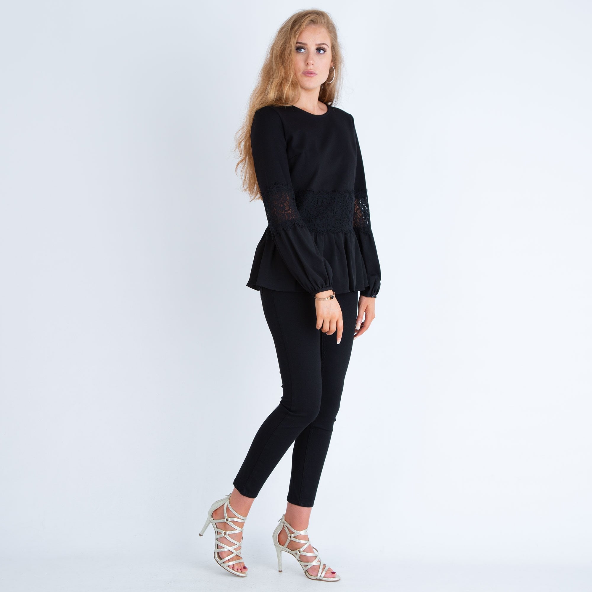 Twinset Black Long Sleeve Top With Gathered Peplum And Lace