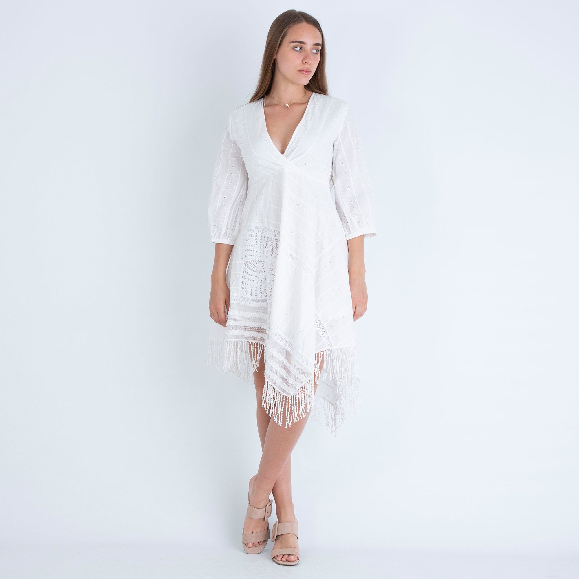 Twinset Embroidered Linen Dress With Tassle Hem White