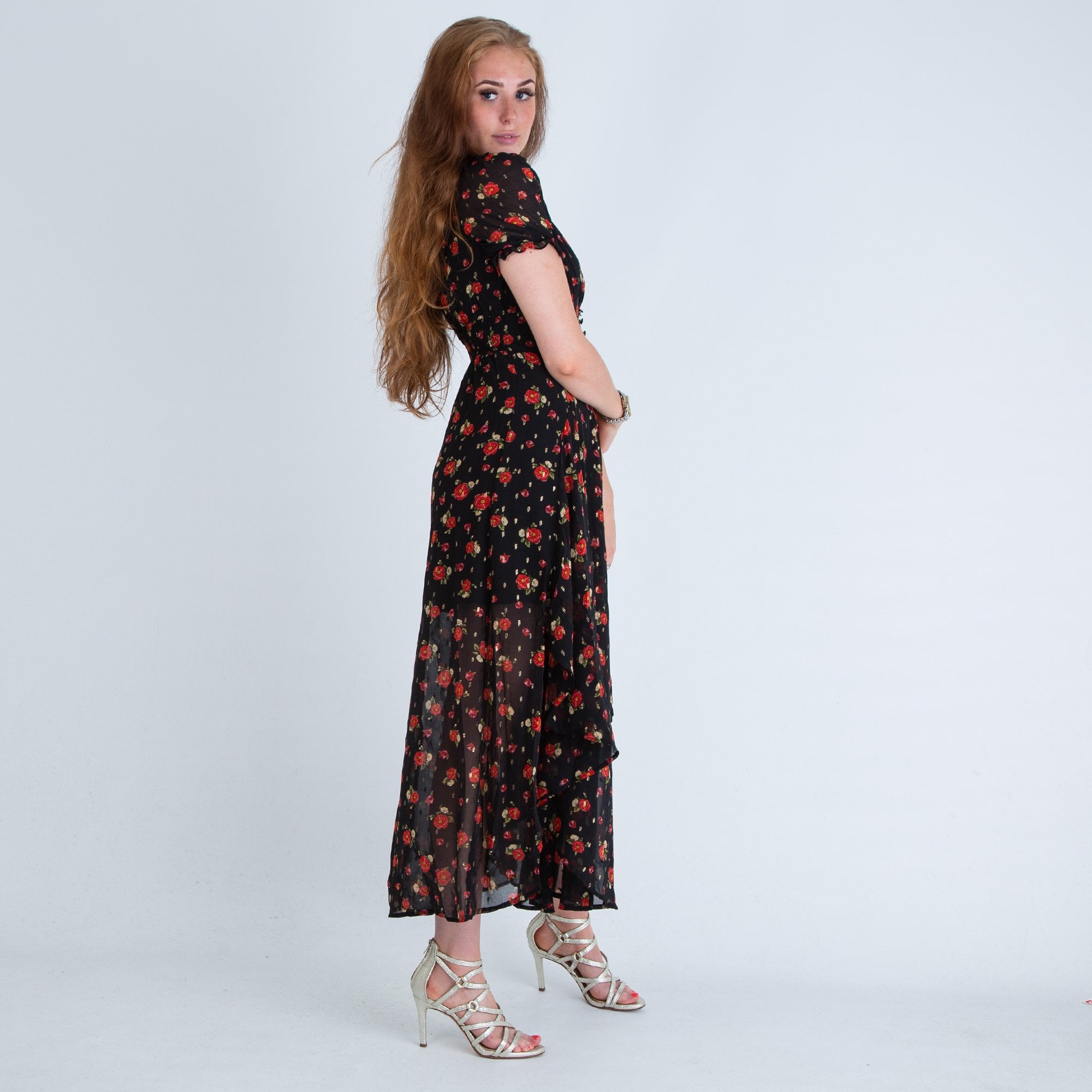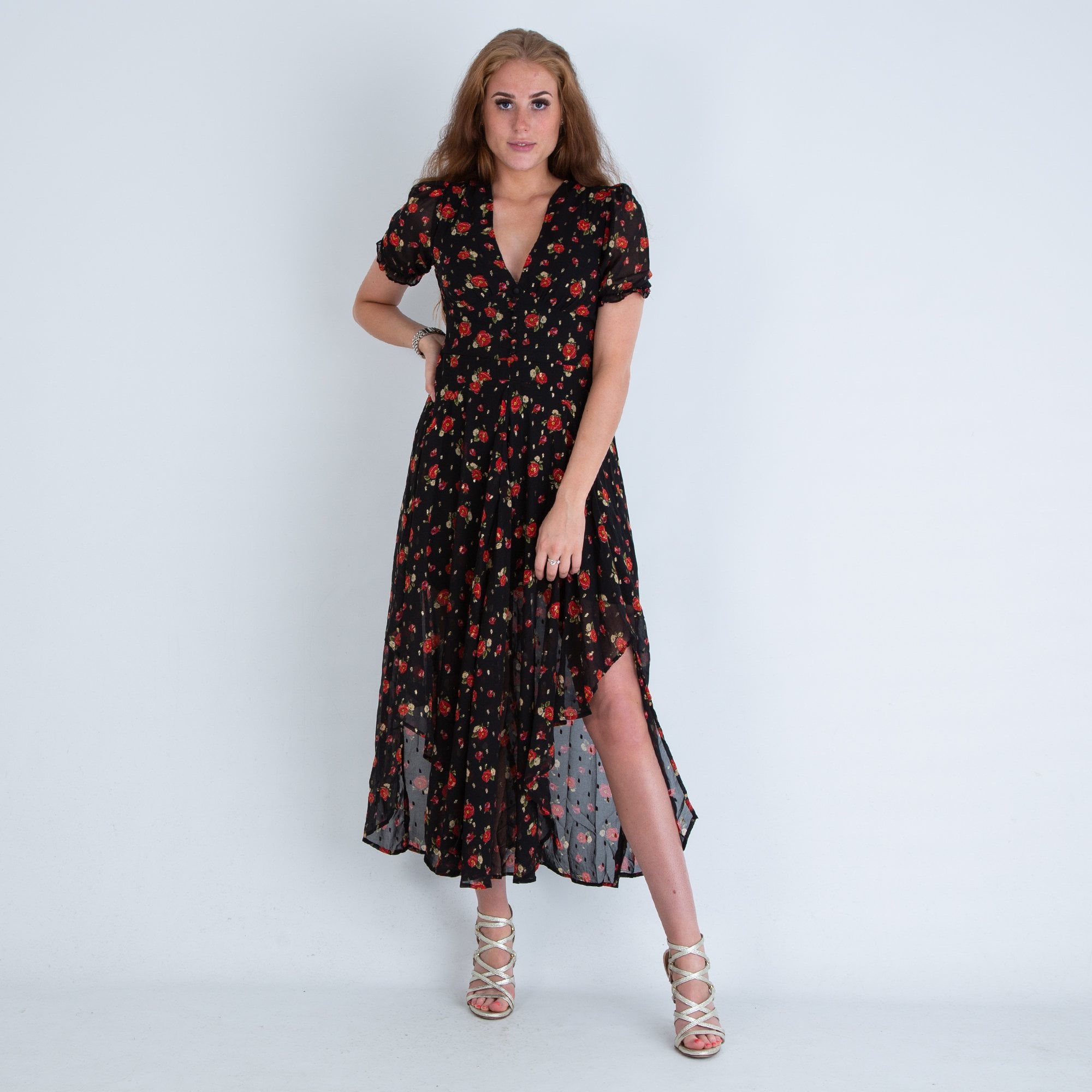 Y London Scarlett Floaty Rose Print Midi Dress With Button Front Black/red